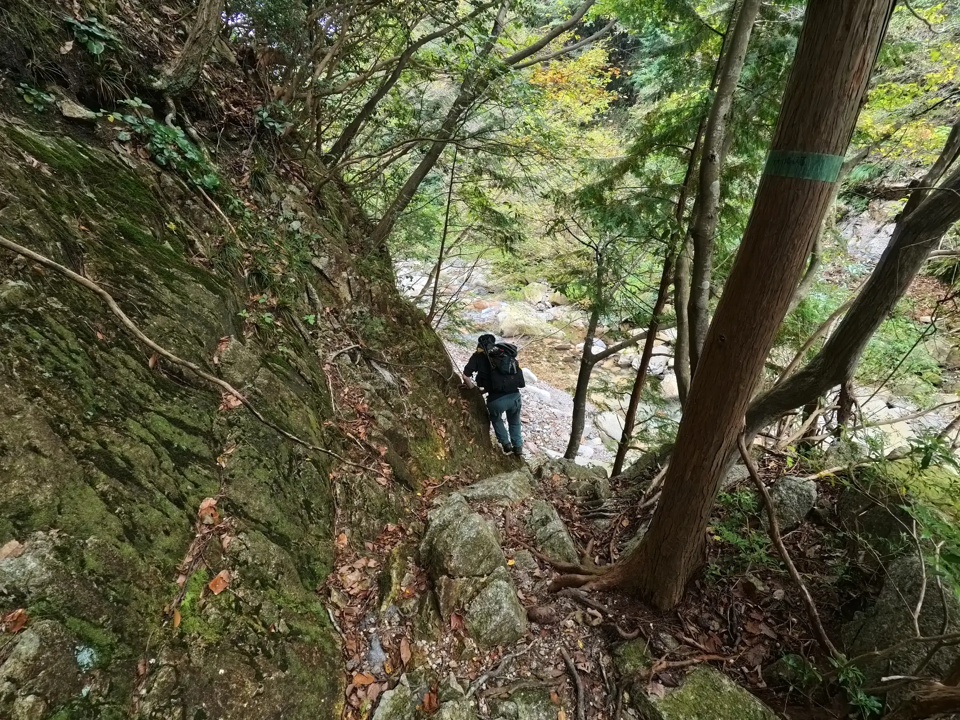 長尾滝へ続く道で、1番の難所につきました。大きな岩をロッククライミングするように降りていきます。ロープがつけてあるので、使いながら降りましょう。降りたらすぐ小さな川を越えます。