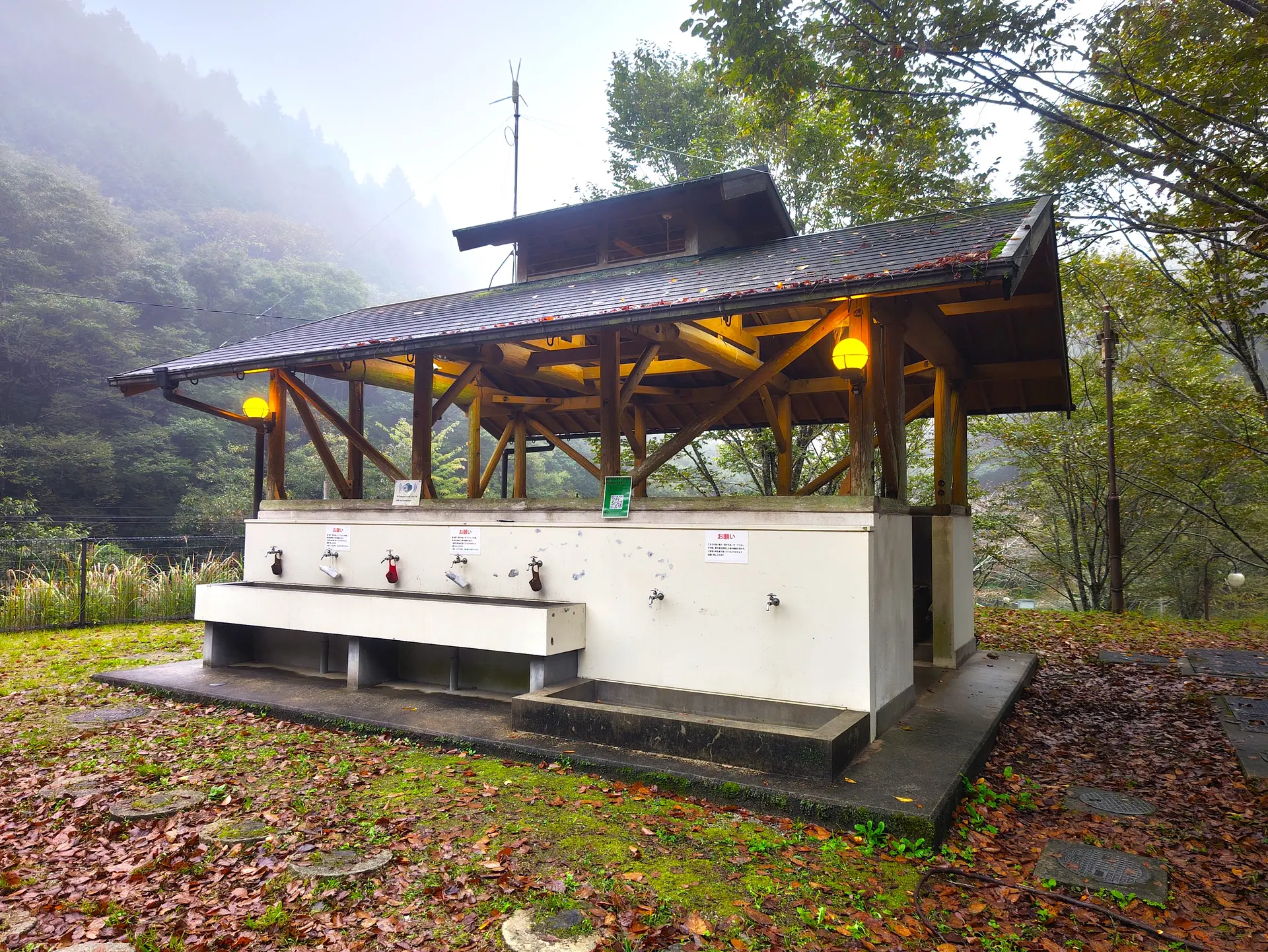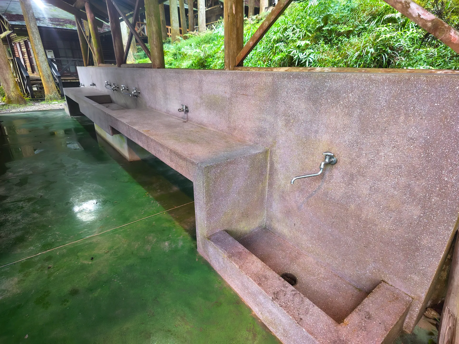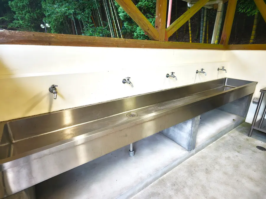 ログハウス内にキッチンもありますが、もちろん共有の炊事場もありますよ。焚火台やBBQコンロなど大きいものを洗う時はこちらが便利ですね!