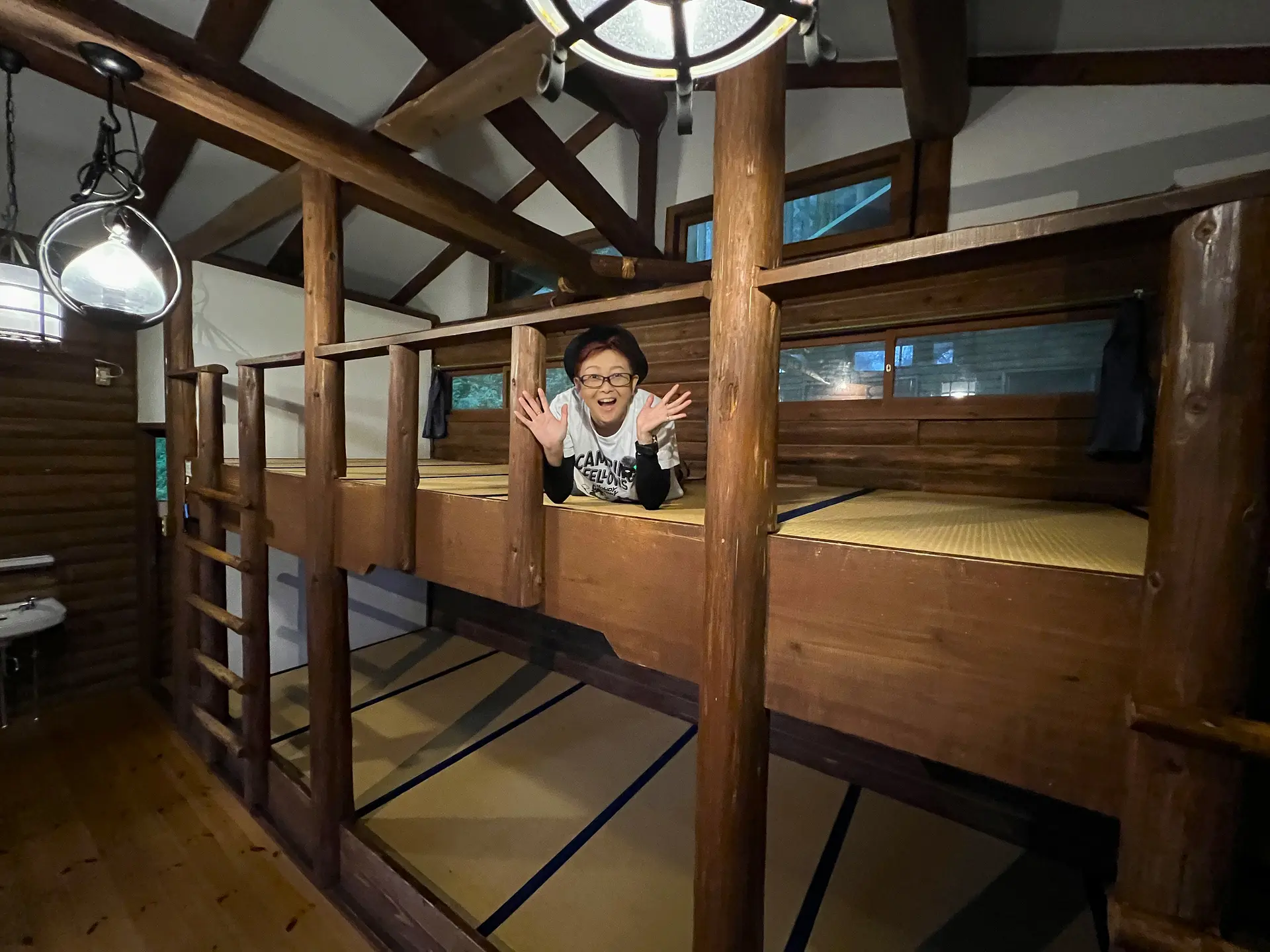 実は私、小学生の頃にこのログハウスに泊まったことがありまして、今でも大きな2段ベッドのインパクトが鮮明に残っています!子供達が大喜びする2段ベッドが魅力ですね!