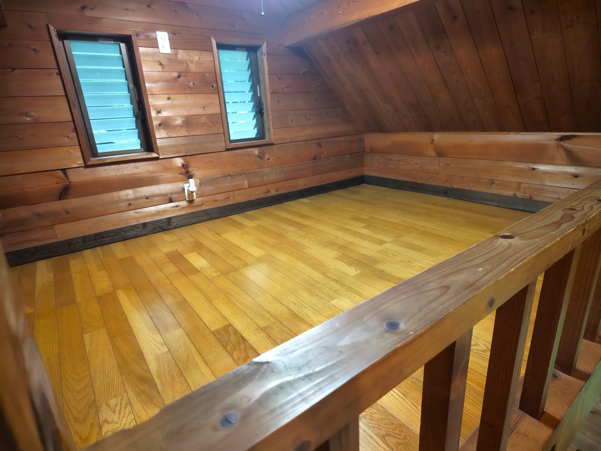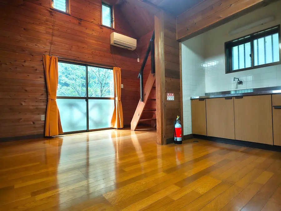コテージ内は約8畳、さらに4.5畳のロフト付き!バルコニーもあります。こちらのコテージも定員は6名です。キッチン、エアコン(冬季はファンヒーター)、Wi-Fi完備なので快適ですね!