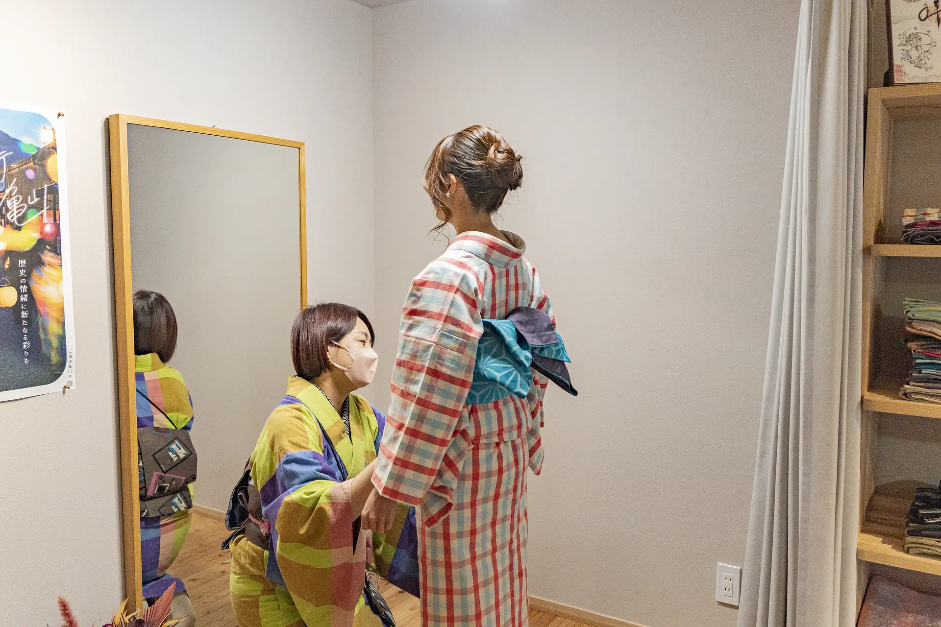 鏡の前のスペースに靴を脱いで上がり、カーテンを閉めて始まります。2部式の長襦袢を借り、その上に着物を羽織ります。寒い日は暖かい下着の上から着せてもらうのがおすすめ。足袋と草履、バッグまでレンタルできるので、手ぶらで体験OKなのが嬉しいですね♪