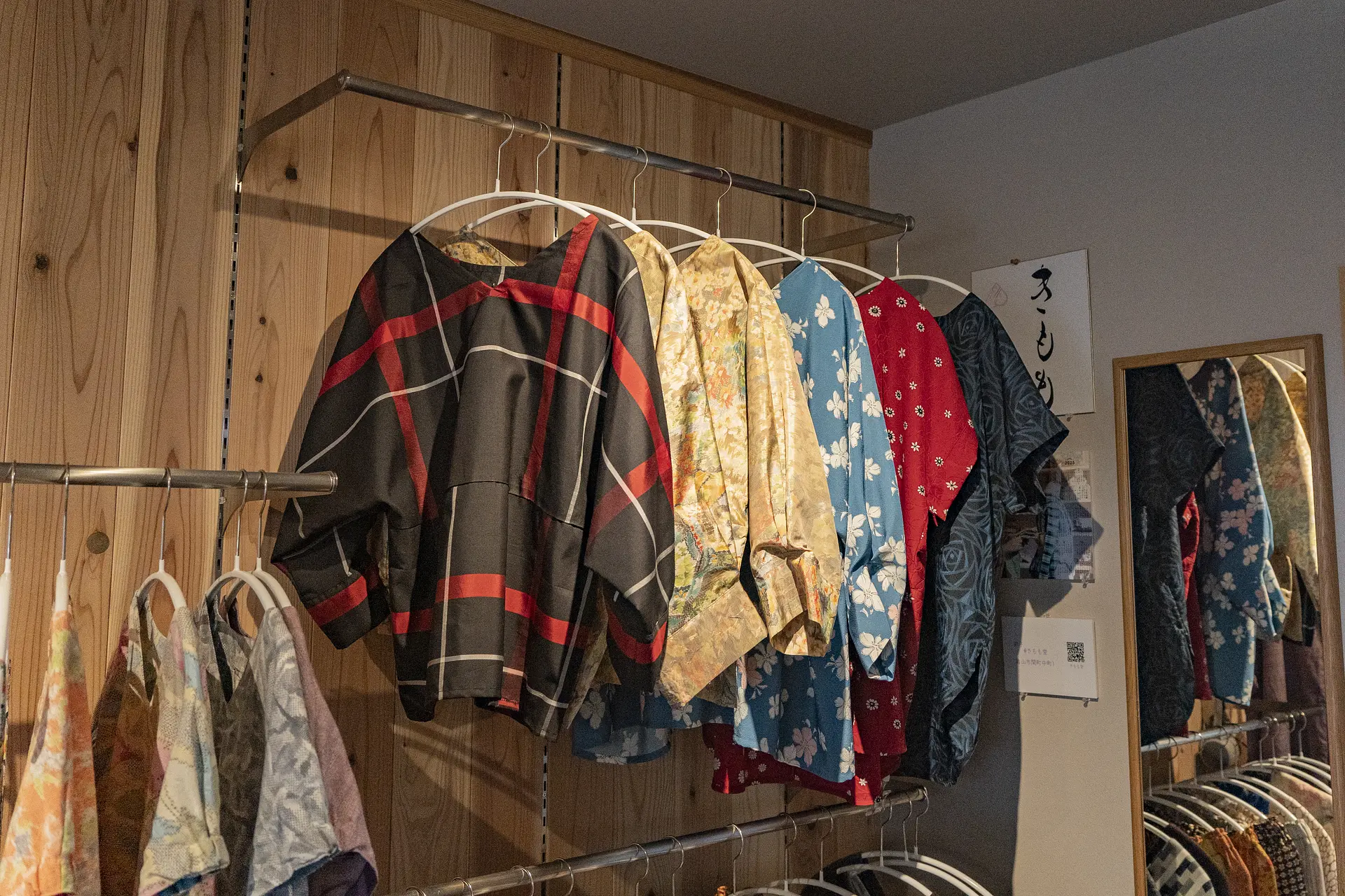さて、きもも堂さんは、古き良き日本の伝統文化「着物」の魅力を発信するため、洋服にリメイクし、より身近に着物を感じる活動もされています。絹やウールの上質な着物から生まれ変わった着物リメイク服や小物を、お店で購入することができます。