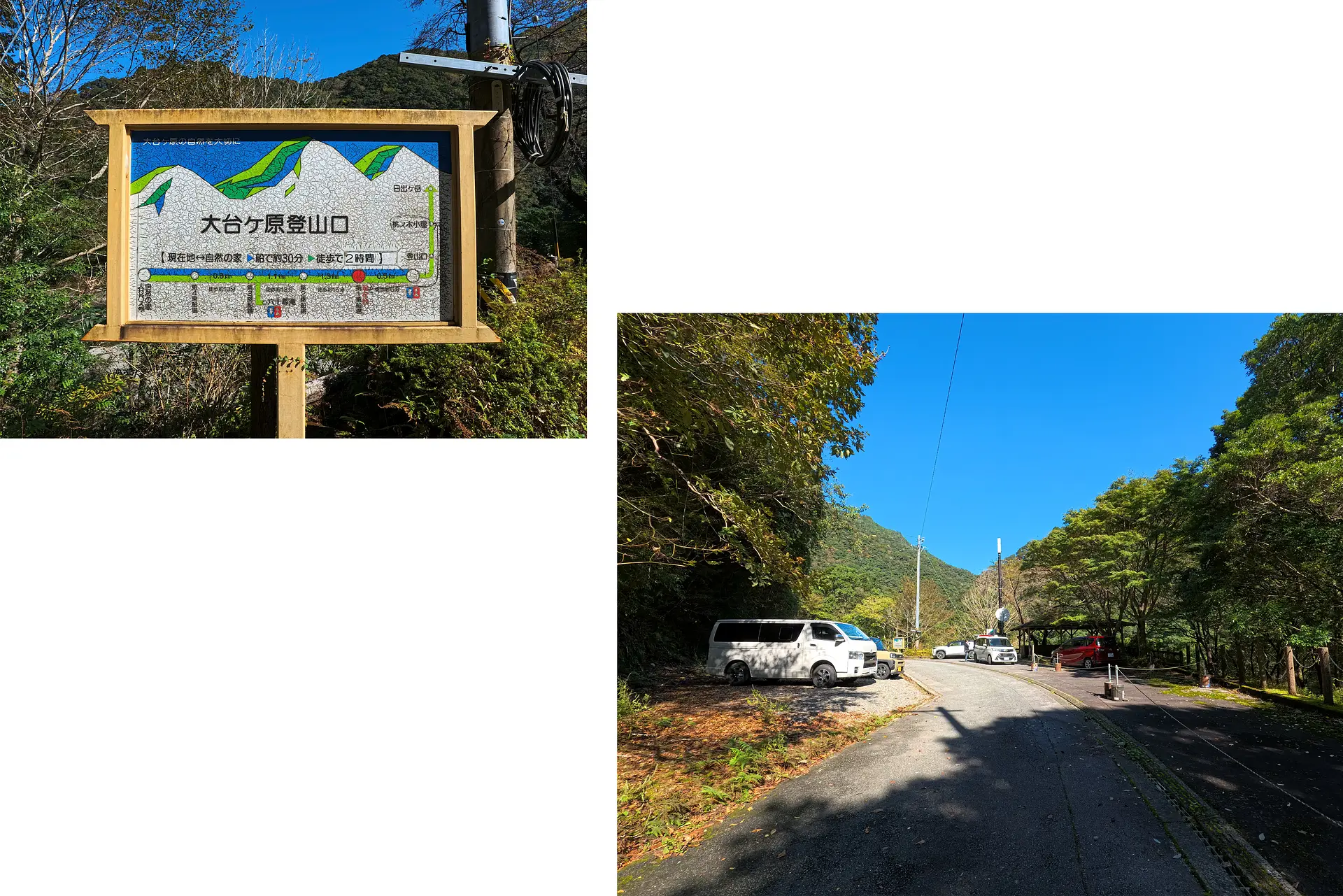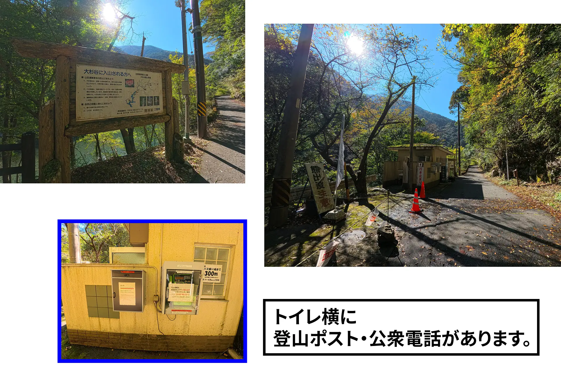 途中下車もしつつ出発から約1時間30分ほどで、大杉谷登山口に到着します。駐車場から歩いて数分のところにトイレがあります。これより先の登山道にはトイレはありませんので、こちらをご利用ください。また、トイレの外に登山ポスト・公衆電話があります。