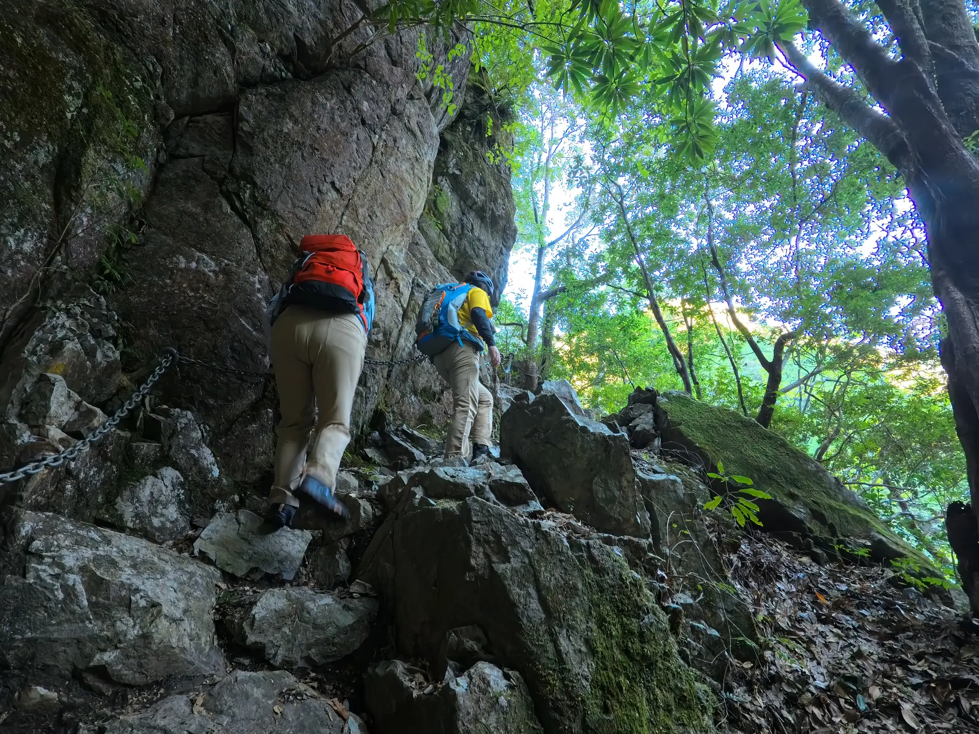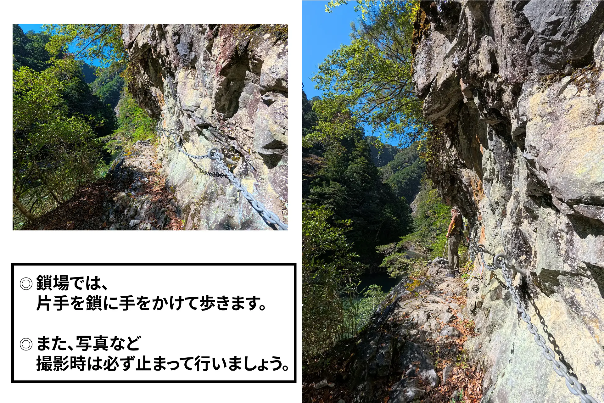 岩場の壁側に鎖が設置されていますので、必ずつかんで歩きます。写真撮影をする際には、歩きながらの撮影は危険なため、必ず止まってから撮影するようにしてください。