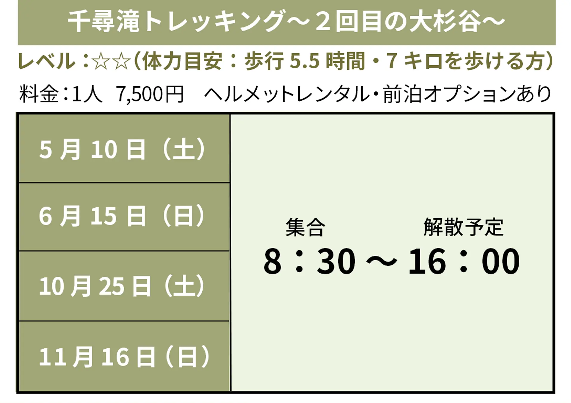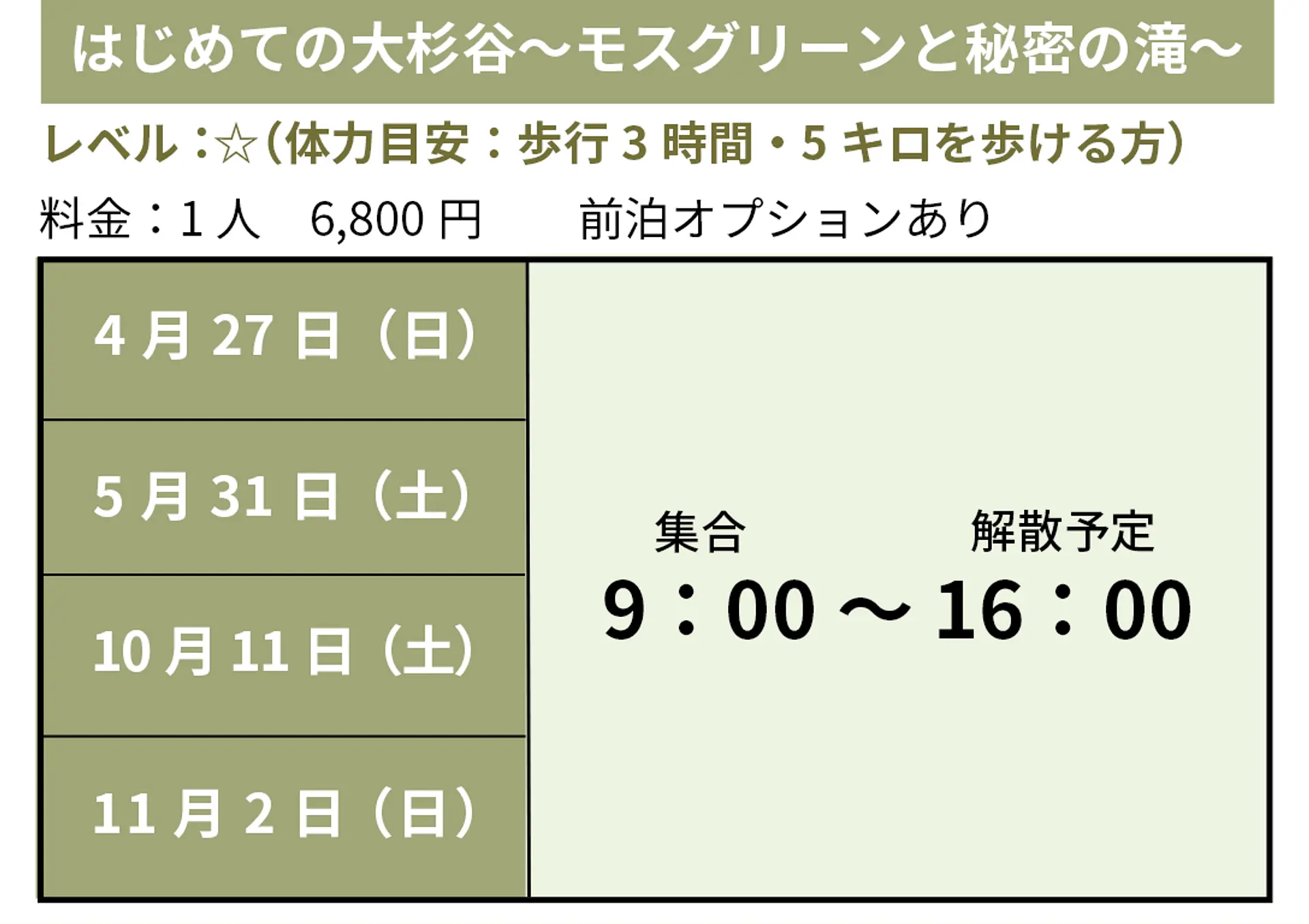 今回、記事でご紹介した「はじめての大杉谷〜モスグリーンと秘密の滝〜」の2025年のツアー日程は、下記の通りです。
