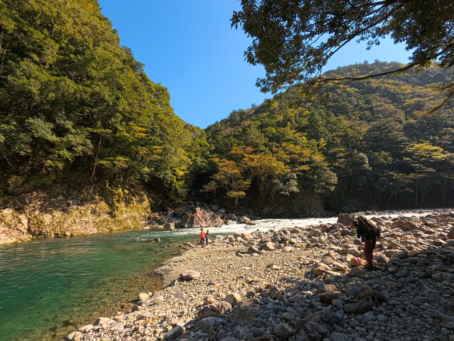 ツアーの目的地の京良谷に到着です。この河原でお昼ごはん・休憩を取ります。京良谷・エメラルドグリーンに輝く宮川を眺めながら休憩します。休憩後は、元来た道で下山します。
