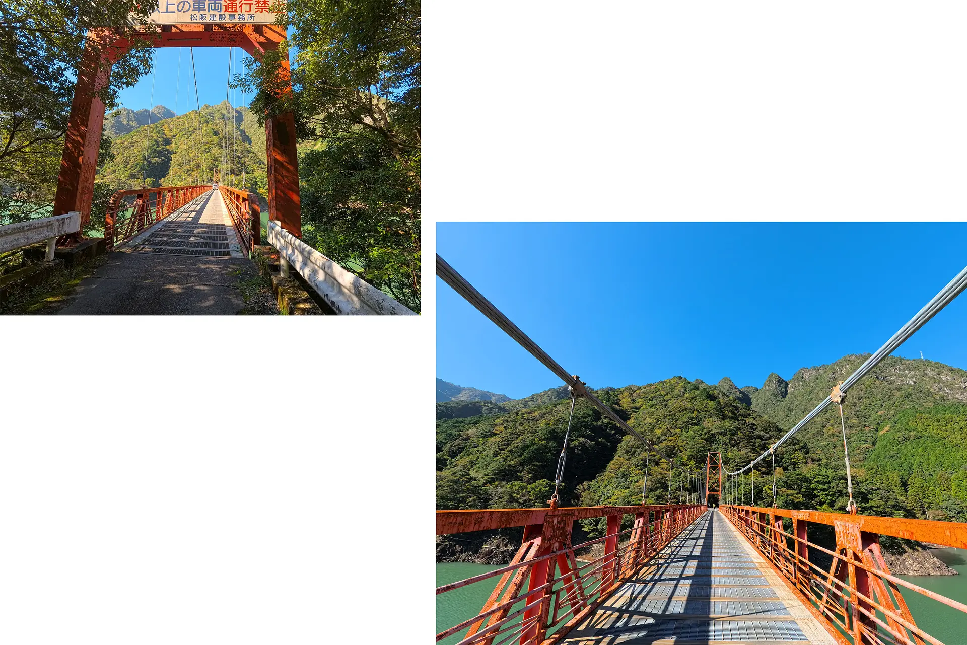 大杉谷へ登山する際に車で通る道ですが、ここを歩いて渡ります。橋が透けているので、とてもスリリング!!なんとこのスリリングな橋は動物も渡るそうです!山や川の景色を楽しみながらココを渡ります。