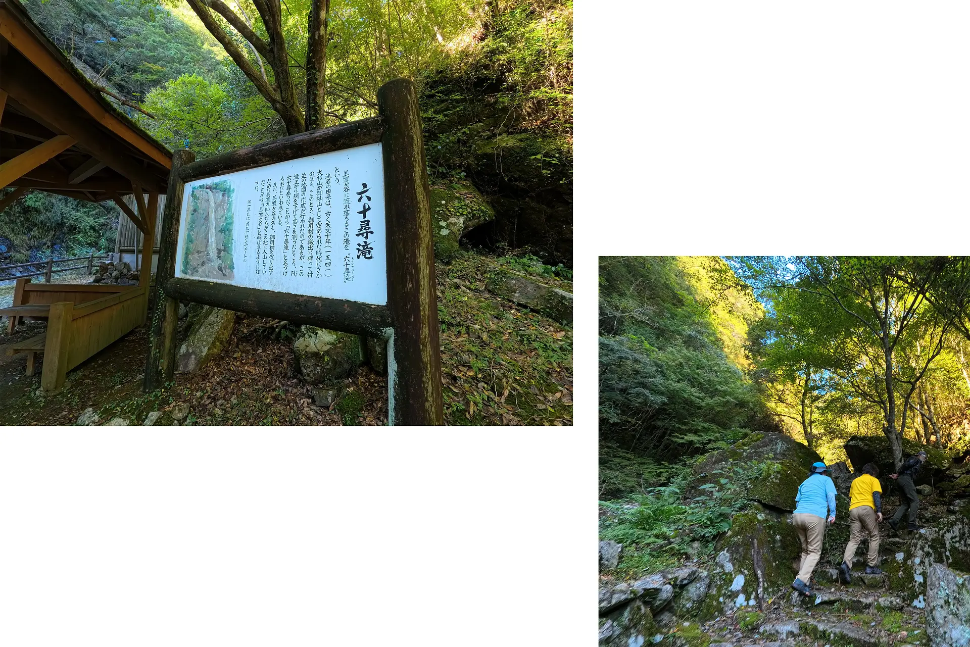 大杉谷登山口へ行く途中にある、落差90mの六十尋滝。前日の天気が雨であると、滝の勢いがド迫力です!取材した前日が、かなりの大雨だったこともあり、かなり滝の勢いと飛沫が多く、ガイドの巽さんも「なかなか見れない景色だ!」とのことでたくさん写真を撮ってらっしゃいました。