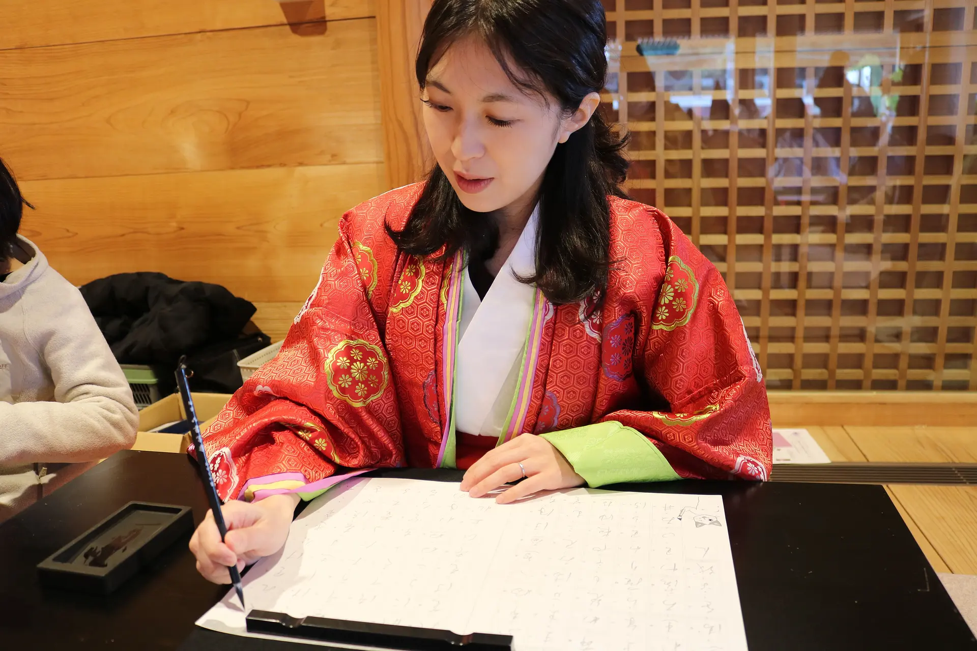 現在、さいくう平安の杜では毎週末 平安時代の貴族の一日を体験できるイベントを開催中! 平安時代といえば、昨年の大河ドラマ「光る君へ」の舞台にもなった今注目されている時代。 体験では、実際に平安貴族の衣装を着て、美しいかな文字を筆で書いたり、大河ドラマにもでてきた平安時代のお菓子「ふずく」を食べたりできます。 さまざまな体験の合間には 神社に奉納される「祭祀舞」が目の前で披露される日もあるので、感動すること間違いなし! 今回みえ旅アンバサダーの西岡莉央が体験してきましたので、その様子を詳しくお伝えします♪