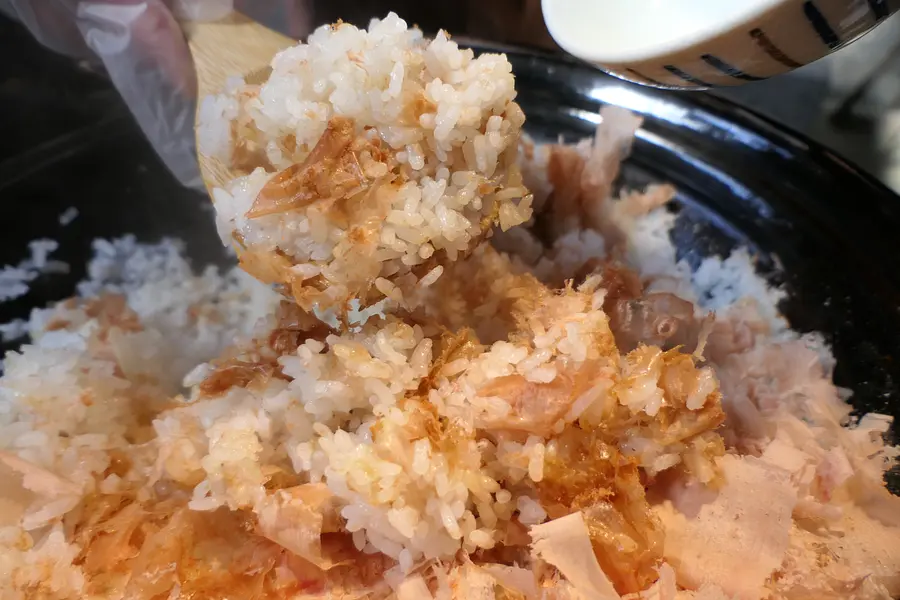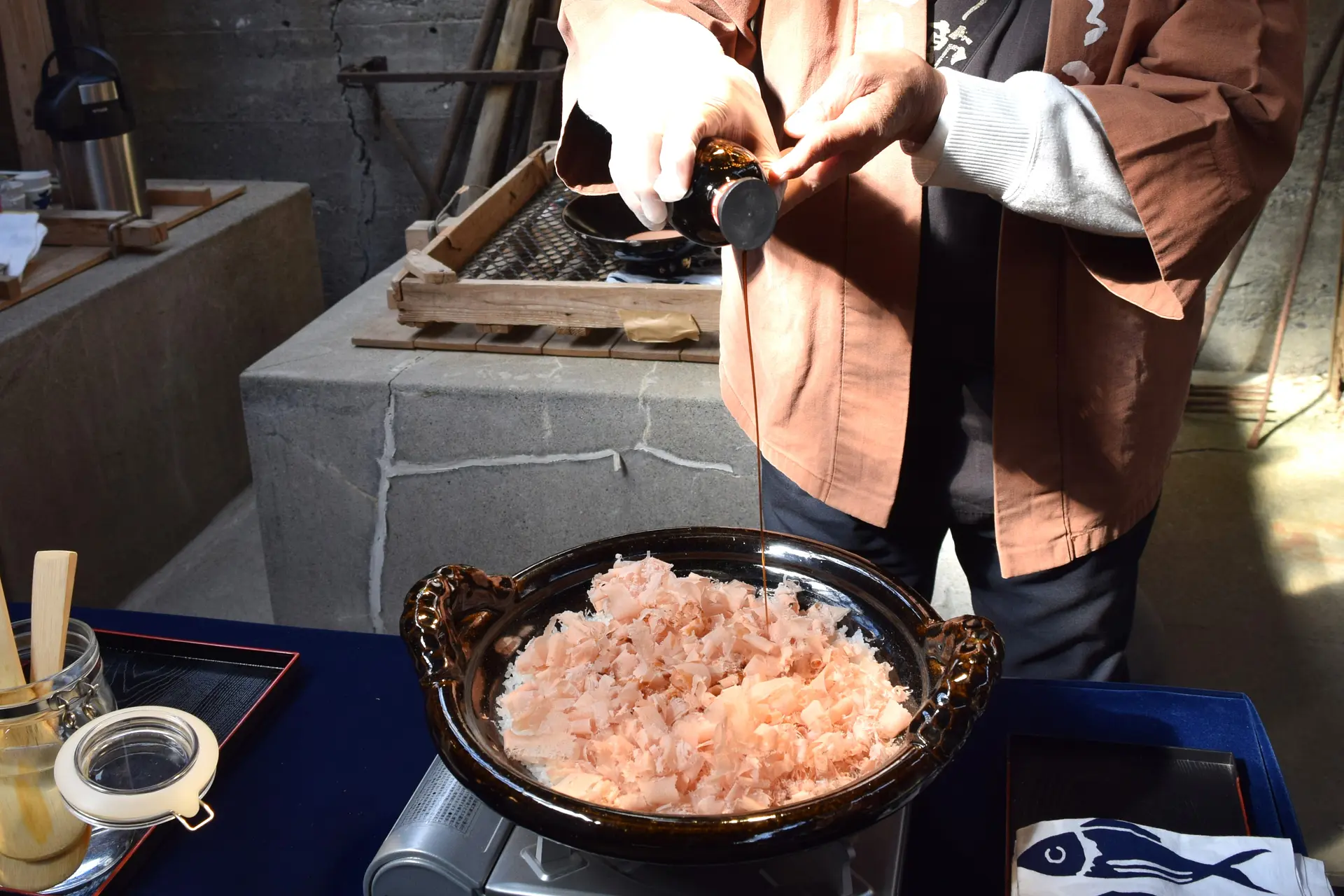 こだわりのお米がプロも使う伊賀焼の土鍋で炊かれ、天白さんが鰹節を混ぜていきます。食欲をそそる良い香り!
