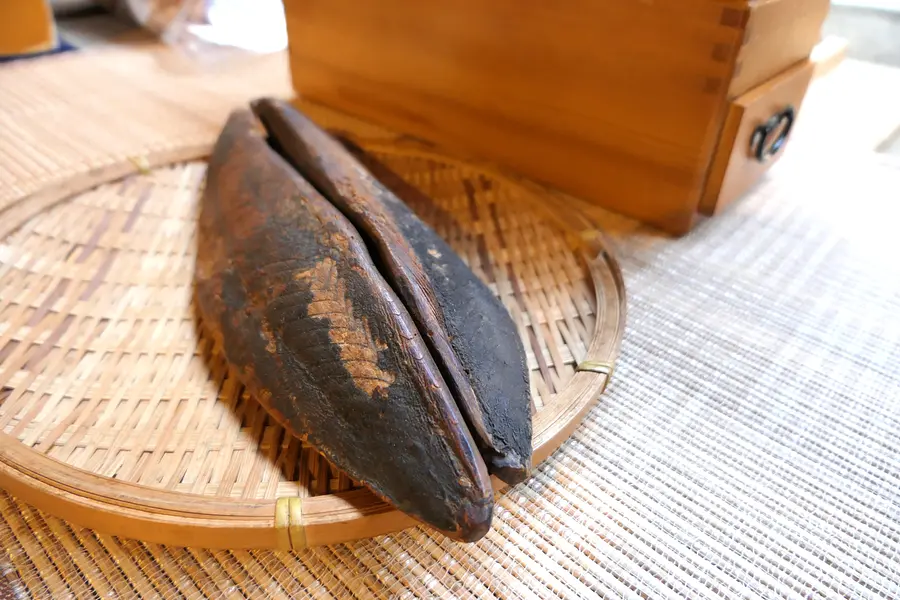 1ヶ月後には、硬く真っ黒になります。水分は18%。この状態で削られたのが、香りの良いピンク色の「花がつお」です。
