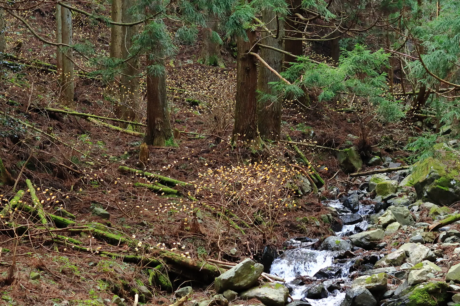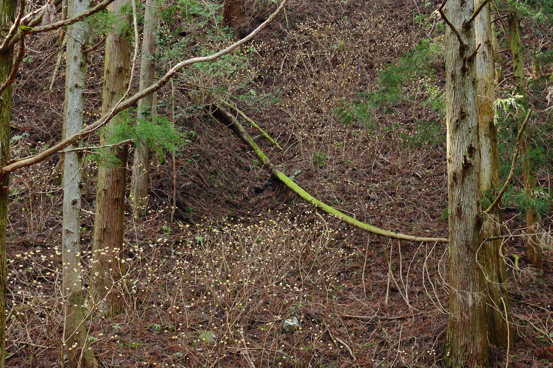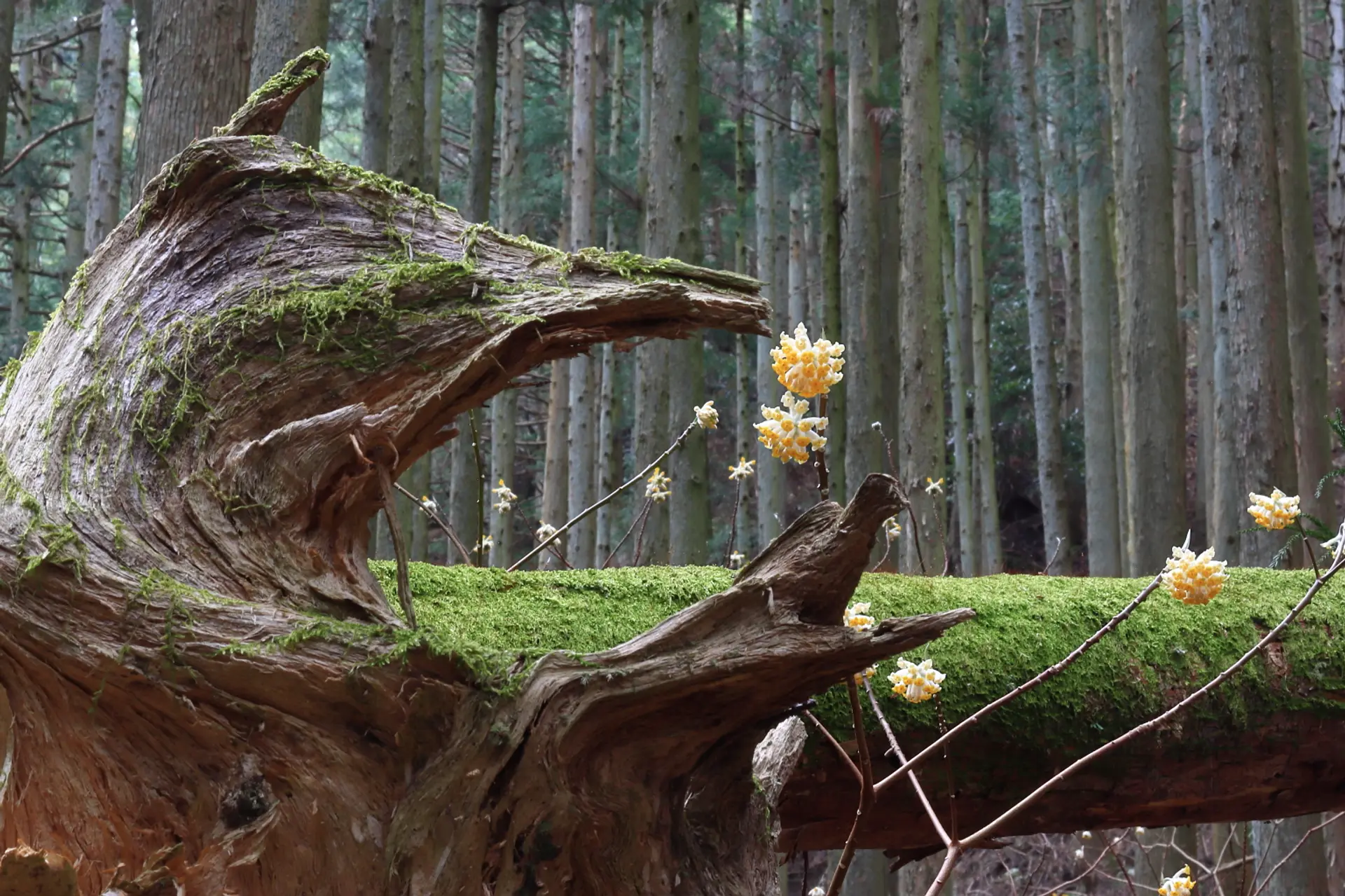 こちらの群生地は、1942年(昭和22年)頃にミツマタが植樹されたのが始まりとのことで、年月が経過した現在ではすっかりと自然の一部となっています。倒木や朽ちた切株もあったりして自然のままという感じです。