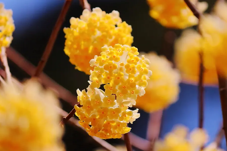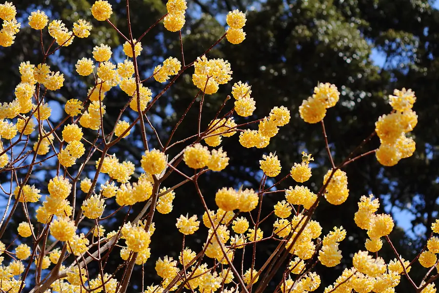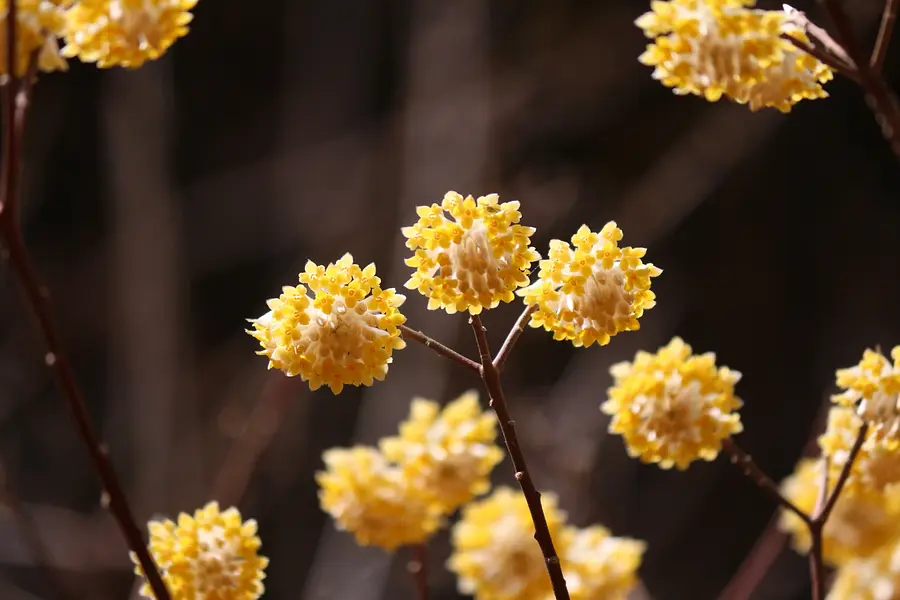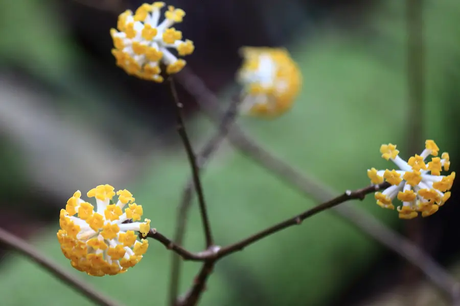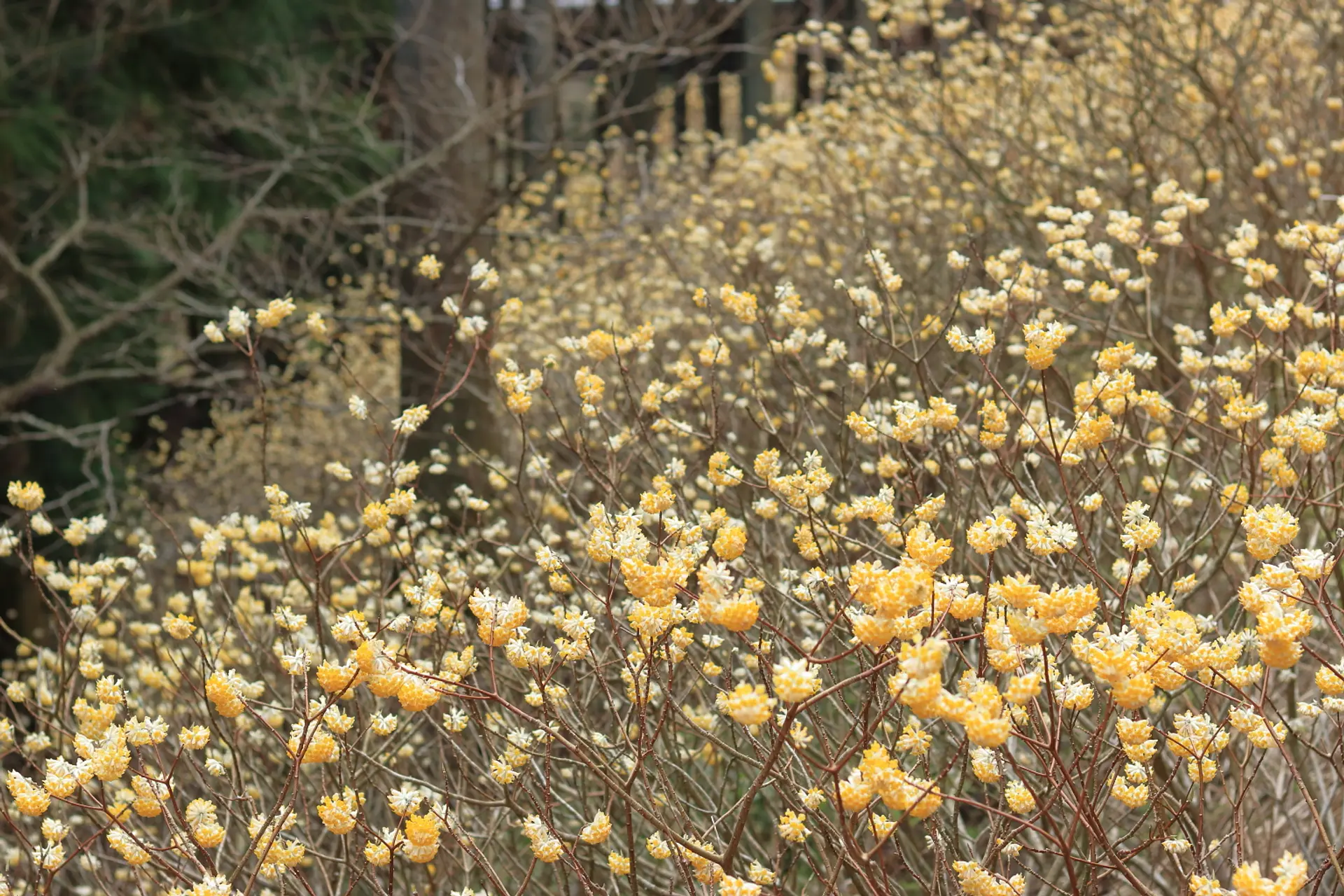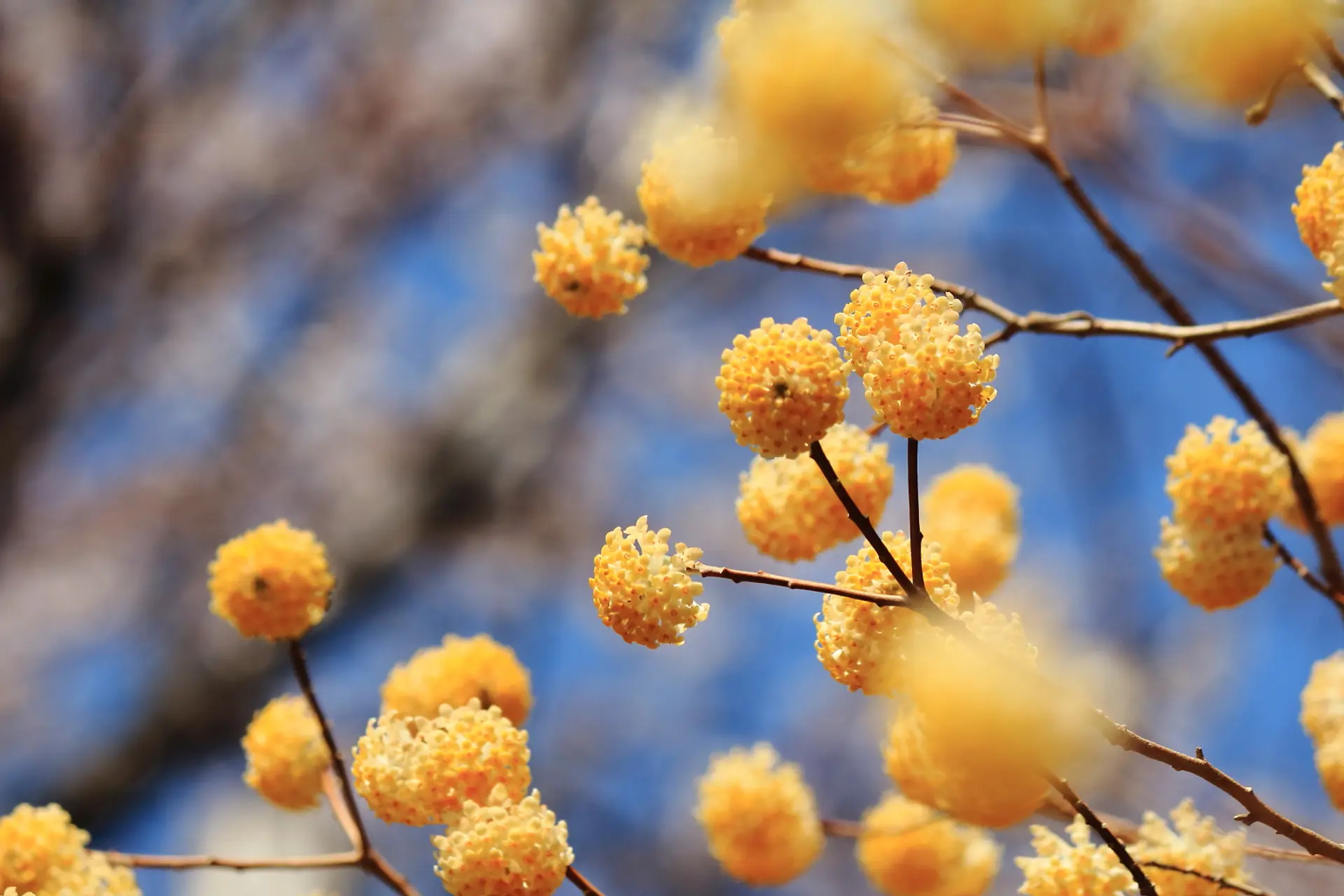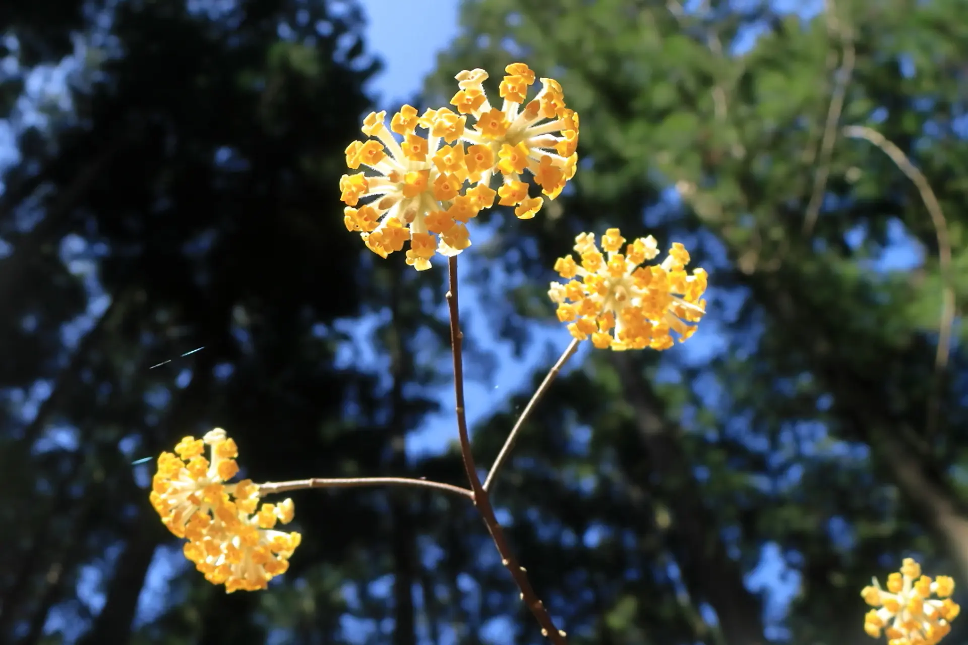 ミツマタとは、日本各地に広く分布するジンチョウゲ科の落葉広葉樹の低木で、枝の先端が3つに分かれるという特徴が名前の由来ともなっています。この3つに枝分かれした先端に小さな花が球状に集まり、黄色いくす玉を思わせるような形をしていて、とても可憐です。