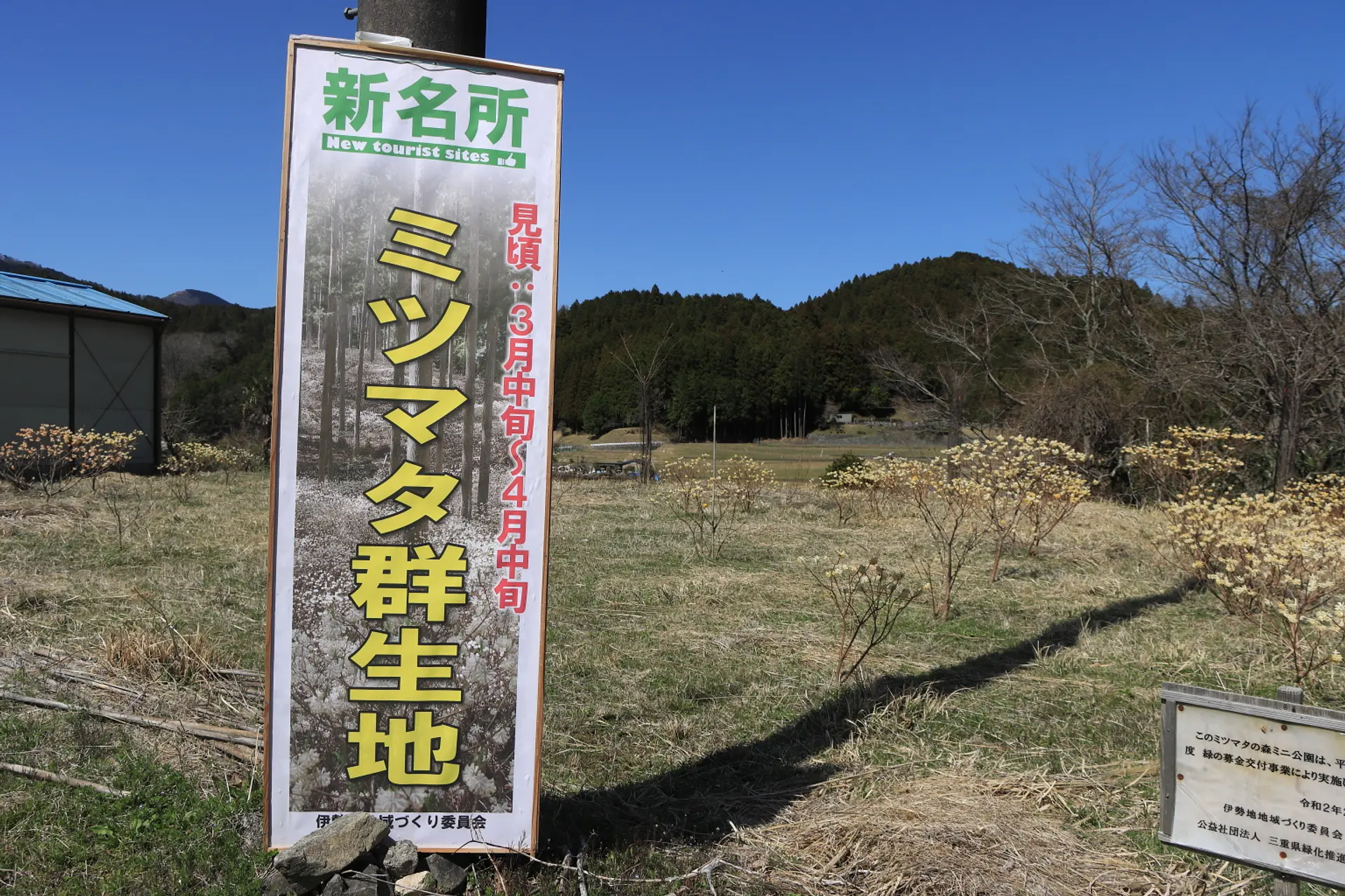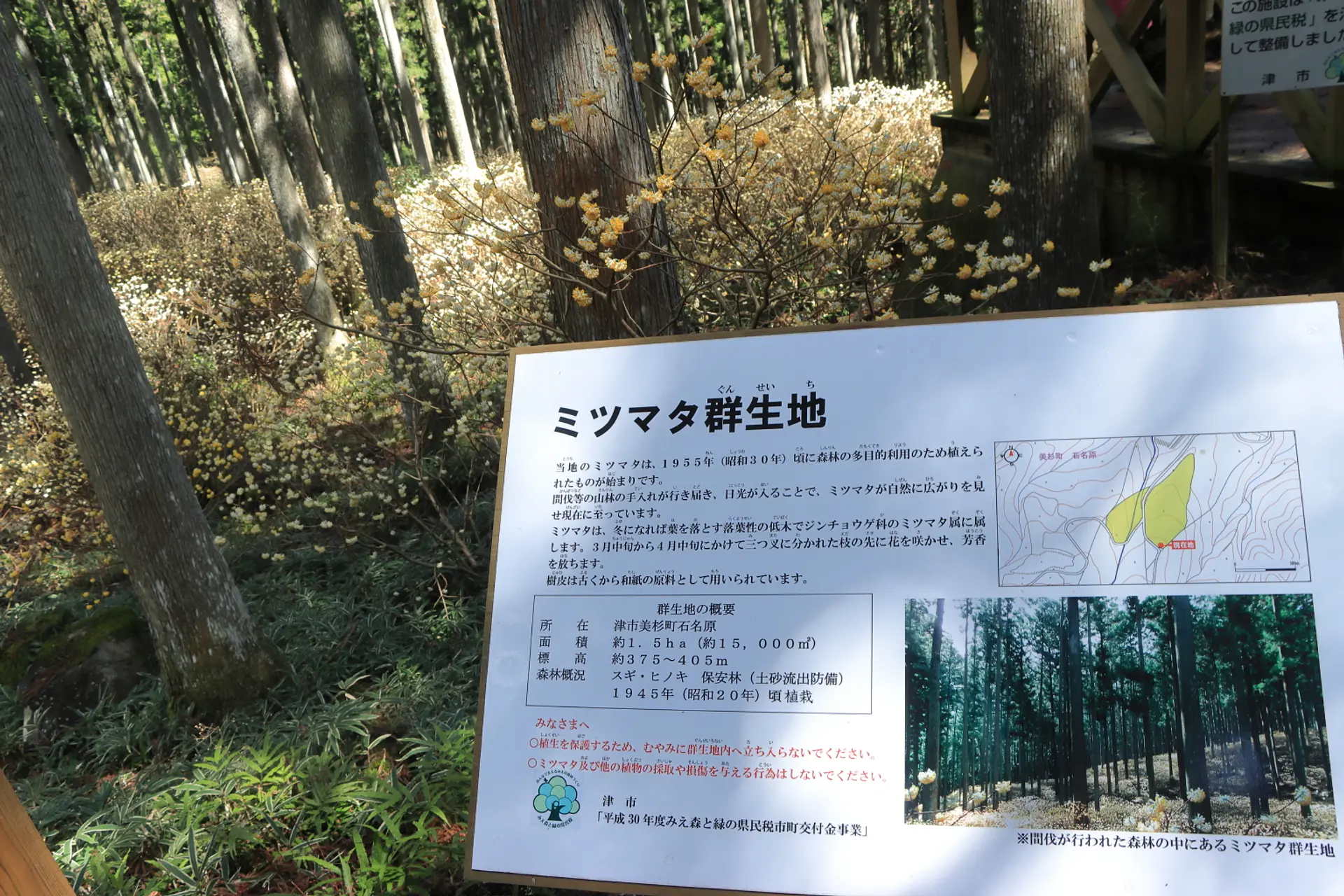 ところ:三重県津市美杉町石名原1681 津市伊勢地出張所(伊勢地地域住民センター)からミツマタ群生地までは約1300m(徒歩20分)
