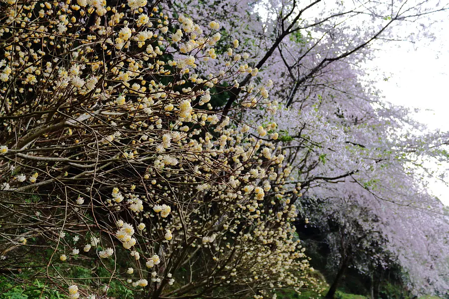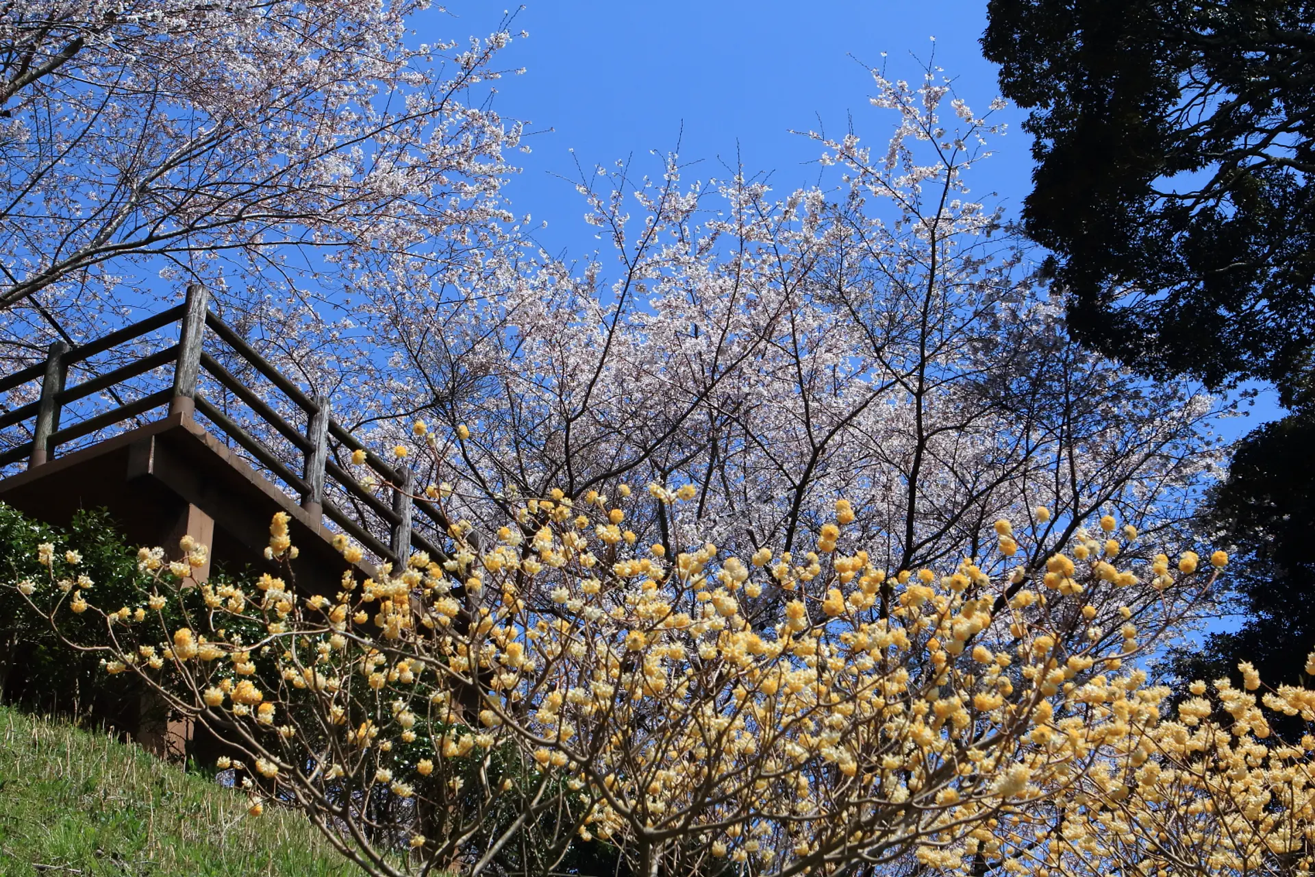 また、桜の開花時期とのタイミングが合えば、ミツマタ越しに展望台側に咲いている桜と一緒に楽しむことができます。