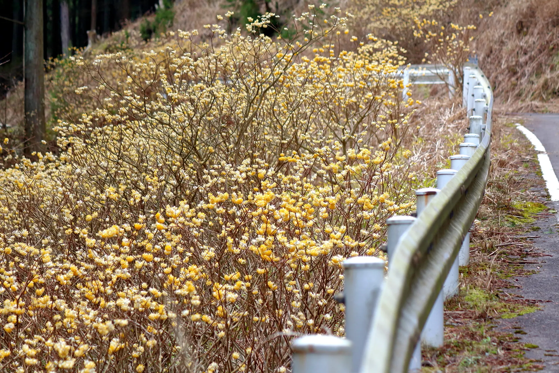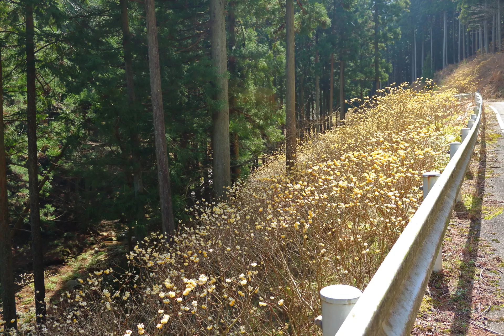 こちらのスポットは「笹子谷のミツマタの園」とも呼ばれていて、筆者が感じた特徴としては、山の中腹へと向かう道路沿いにミツマタが群生していて、車に乗ったまま窓越しに観ることができることです!