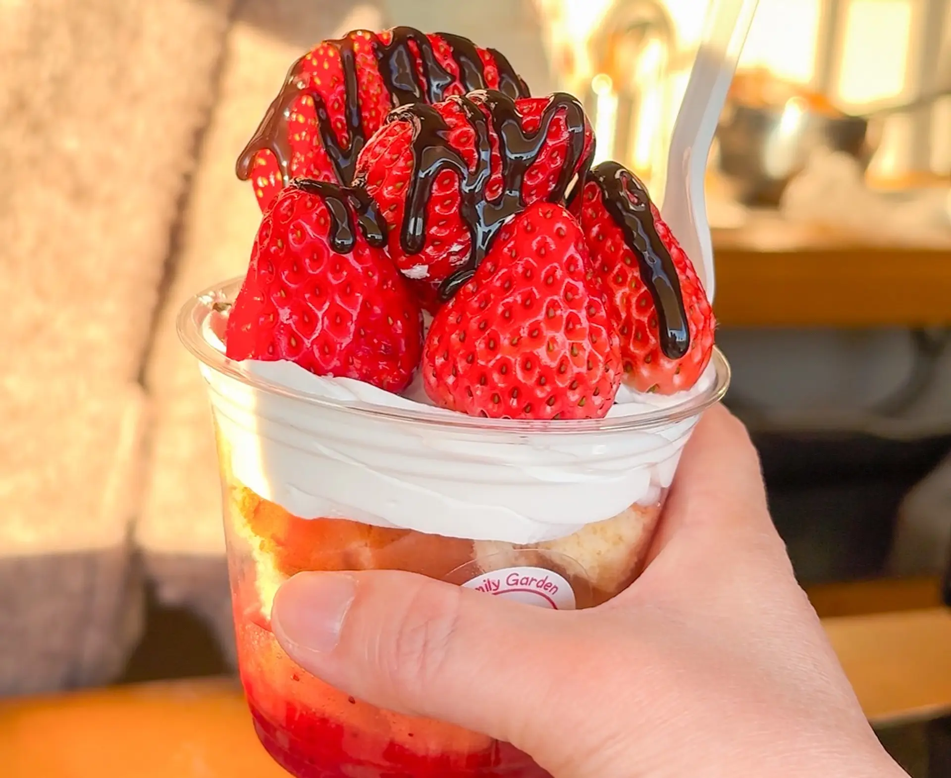 いちご狩り体験をされる方は別途有料で手づくりパフェにも挑戦できます。フードトラックでいちごジャム、スポンジ、生クリームが入ったパフェの土台をもらったら、ハウスでお好みのいちごを好きなだけ収穫してオリジナルいちごパフェを完成させます。完成後は練乳をかけてもよし、フードトラックに戻ればチョコソースをかけてもらうこともできますよ!(いちごパフェ1個400円)