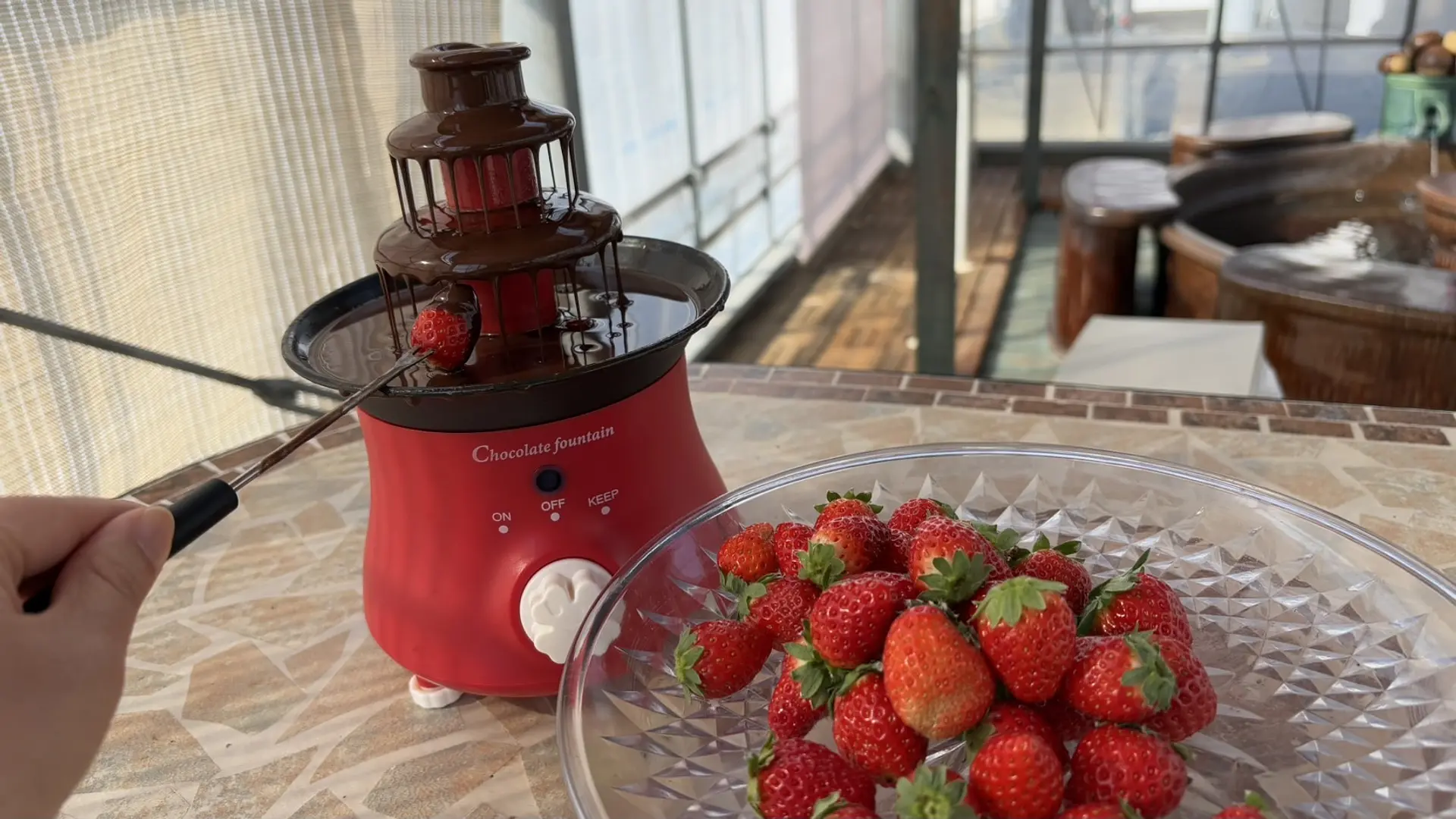 足湯がある建物内には実はもう一つのおもしろ体験があるんです。それがなんと無料のチョコフォンデュ体験!施設内で採れたいちごが用意されていて、専用の串でチョコにディップ♪冷たいいちごに温かなチョコがかかった至福のおやつ体験ができますよ。