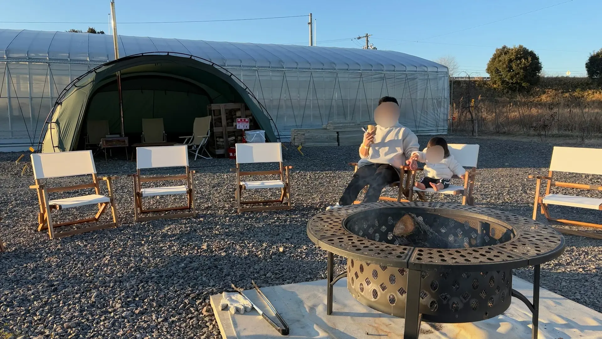 いちご狩りを楽しんだ後や合間にはたき火でチルタイム♪薪ストーブが完備されたテントエリアもあって家族や恋人など、大切な人とまったりくつろげます。