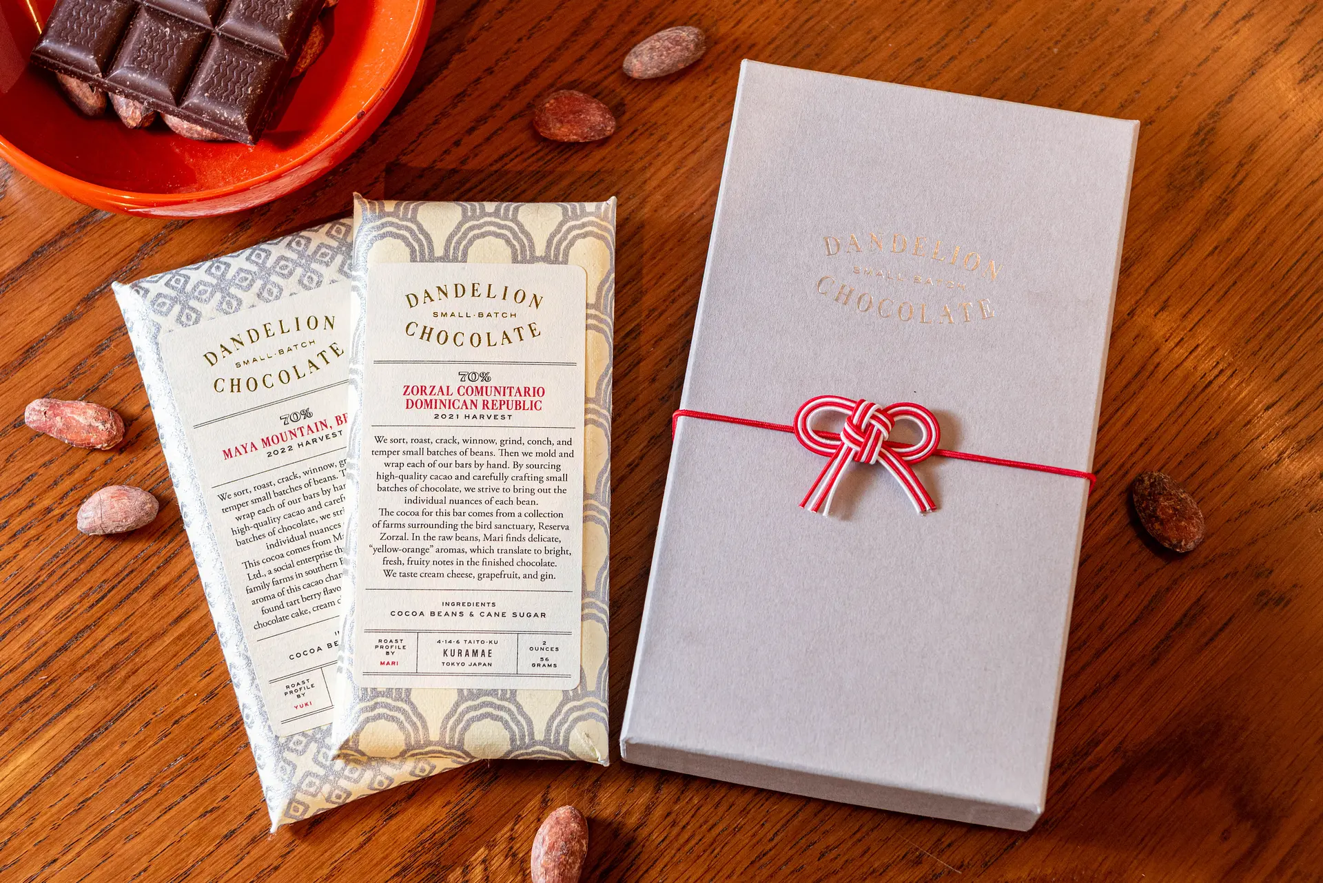 紅白の水引で結ばれた和を感じるパッケージが伊勢らしいこの商品には、季節ごとに代わる2種類のチョコレートバーが入っています。