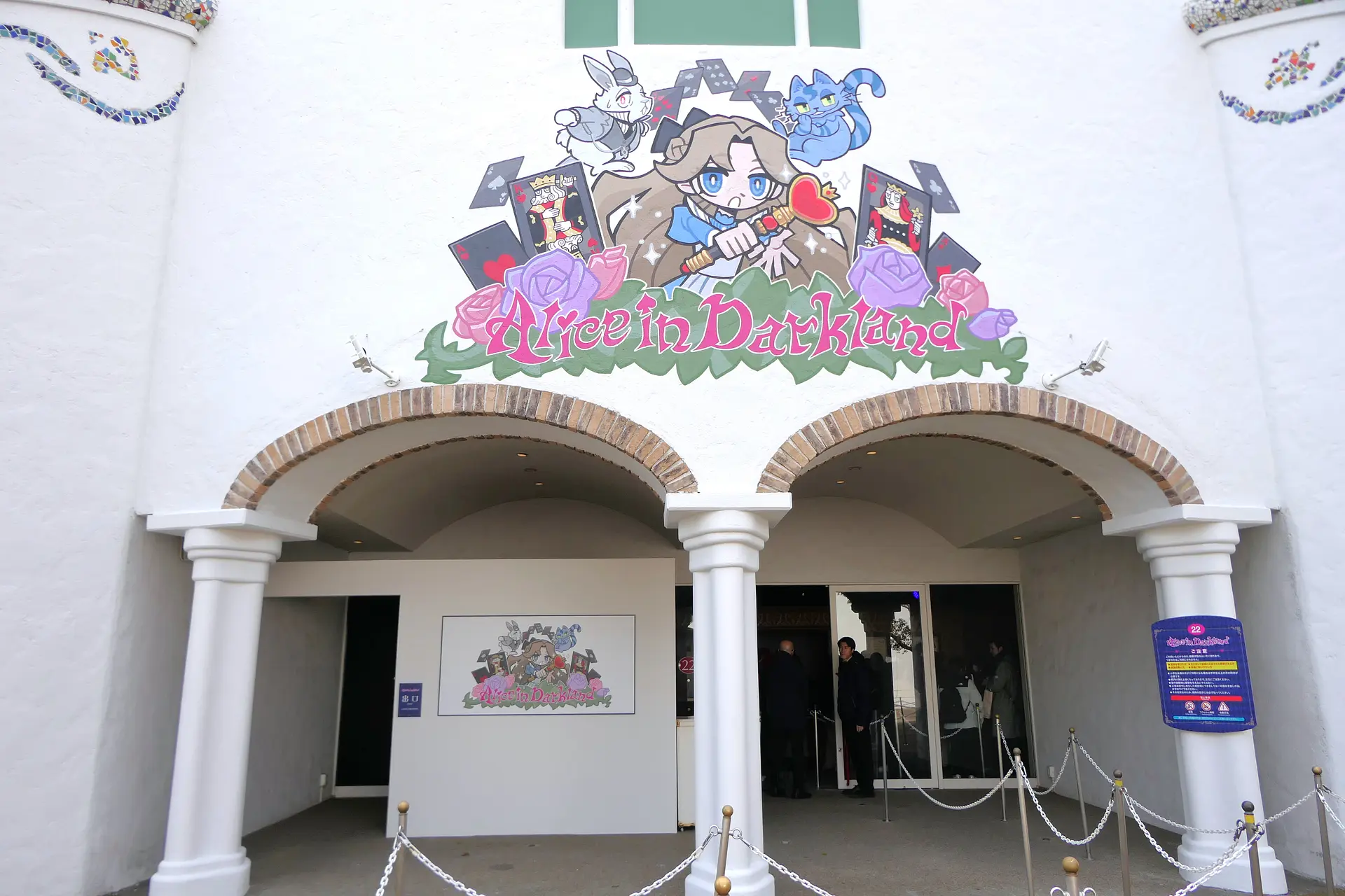 志摩スペイン村を訪れた記念に、入口で写真撮影は定番です!このフォトスポットのデザインも新しくなりました。裏側は新アトラクション「アリス イン ダークランド」の世界観。両方で撮影を楽しんでください。