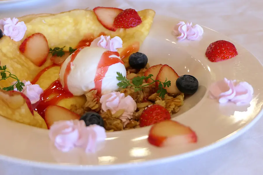 三重県で開発されたいちご「かおりの」が散りばめられた春にぴったりのスイーツ。カフェ「ミ カサ」で提供されます。バニラアイスとピンク色のいちごホイップがかおりのとクレープによく合いますよ。