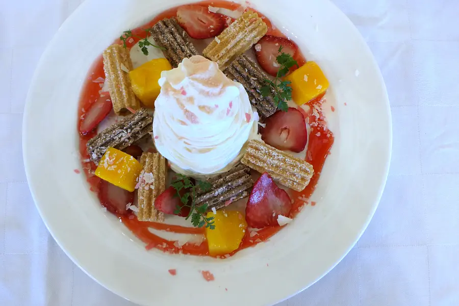 店内で楽しむなら、「チュロスイーツプレート」がおすすめ。シナモン味とチョコ味のミニチュロスとフルーツの中心に、ホイップクリームがどーんと高く盛られています。