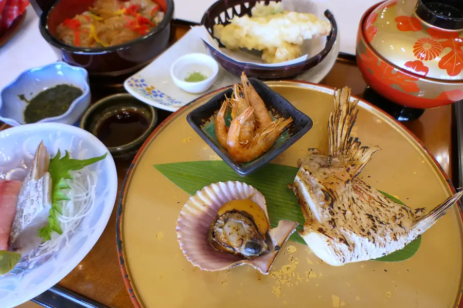伊勢志摩のご当地グルメを楽しみたい方へのおすすめが、ジャパニーズレストラン「的矢」です。志摩スペイン村のある志摩市磯部町の的矢地区は「的矢かき」の産地としても有名。伊勢志摩産の海の幸が味わえる「的矢御膳」には、お刺身、焼き物、天ぷら、あおさの味噌汁に伊勢真鯛を使用した名物「てこね寿司」がラインナップ。