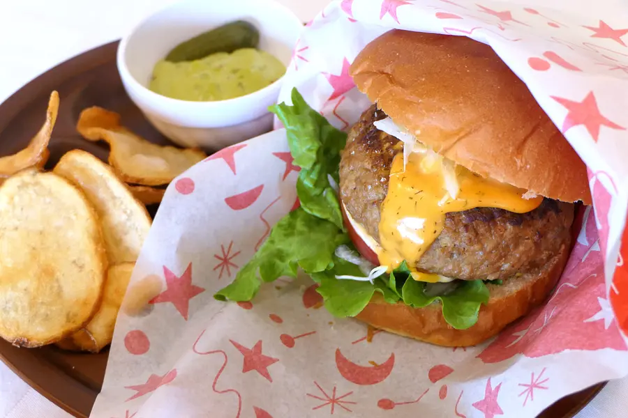 多種多様なメニューがそろうレストラン「アミーゴ」のおすすめは、ボリュームたっぷりのハンバーガー。驚きの分厚いハンバーグ、チェダーチーズ、野菜、アメリカンスタイルのソースが挟まれた高さのあるハンバーガーに、ピクルスが添えられたアボガドソースがよく合います。ポテトチップスはトリュフ風味の塩味。
