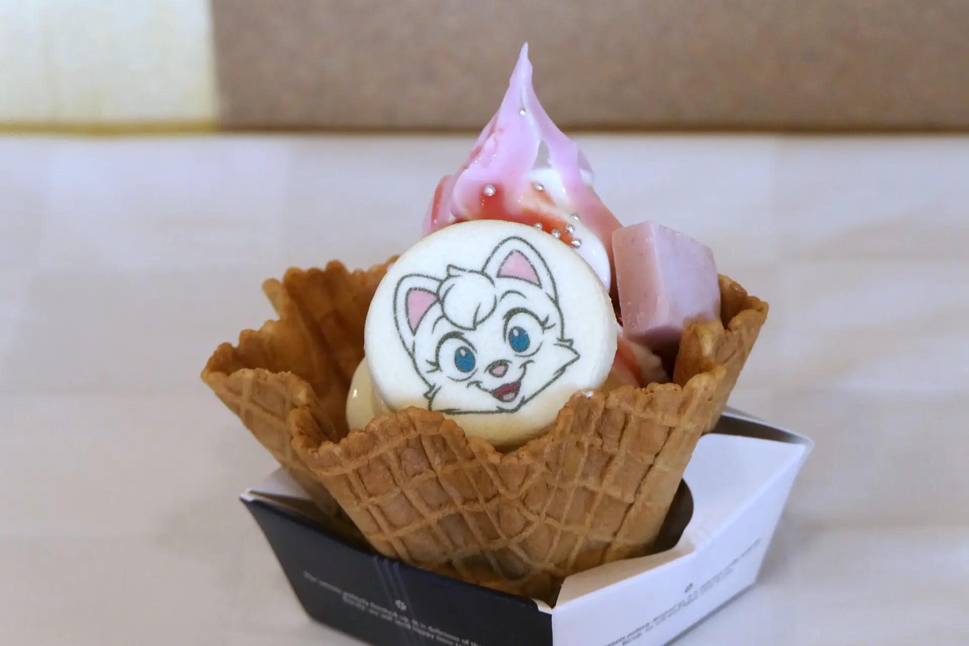 レストラン「アミーゴ」でのデザートにぴったりの、ダルちゃんがプリントされたかわいいクッキーが映えるパフェ。バニラソフトに2種類のストロベリーソースと、おいしすぎるいちご味の生チョコが乗っています。