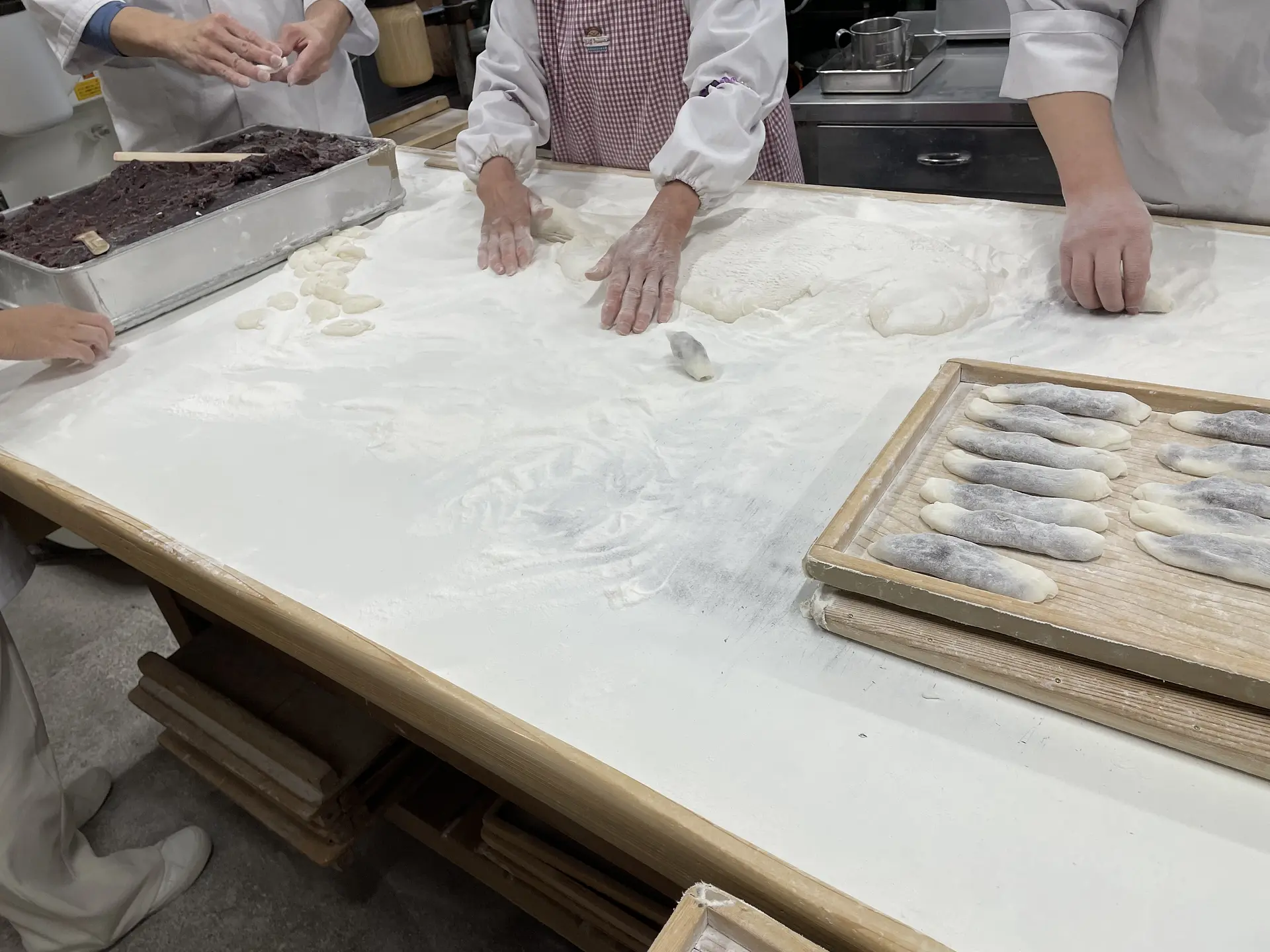 安永餅本舗 柏屋の安永餅の大きな特徴として、一本一本手づくりにこだわっているという点です!丁寧に炊きあげた北海道産の小豆を丁寧につきあげたお餅で包み込みます。お餅の大きさやあんこの量は職人さんの目分量。流れ作業でどんどんと見覚えのある形にできていく様は思わず見入ってしまいました!