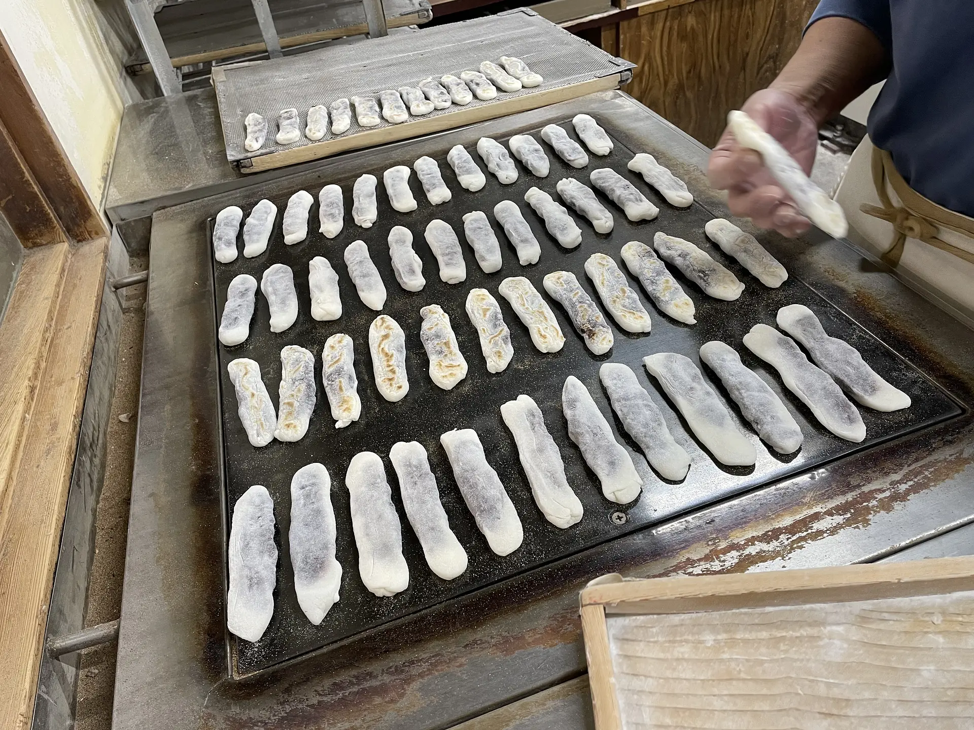 成形された安永餅を一枚ずつ鉄板に並べ、焼き上げていきます。ずらりと並んだ安永餅、いい香りがしてきました!