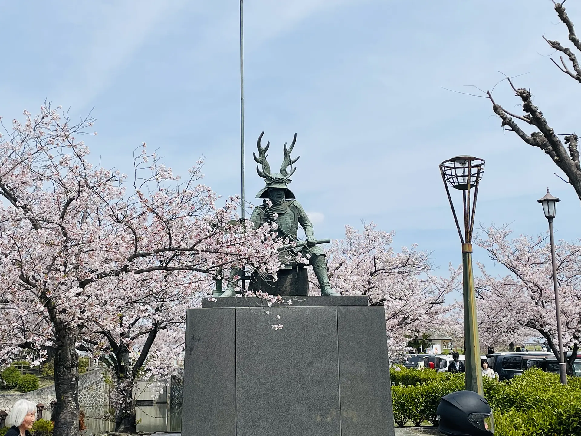 七里の渡跡から歩いてすぐ、かつて桑名城があった土地は現在九華公園(きゅうかこうえん)として市民憩いの場になっています。桑名藩初代藩主であり、徳川四天王の一人として有名な戦国武将本多忠勝(ほんだただかつ)の銅像は迫力があり、桑名市民を見守っています。桜の名所としても有名で、今でも残るお堀や石垣の遺構と桜の景色は見物ですよ。