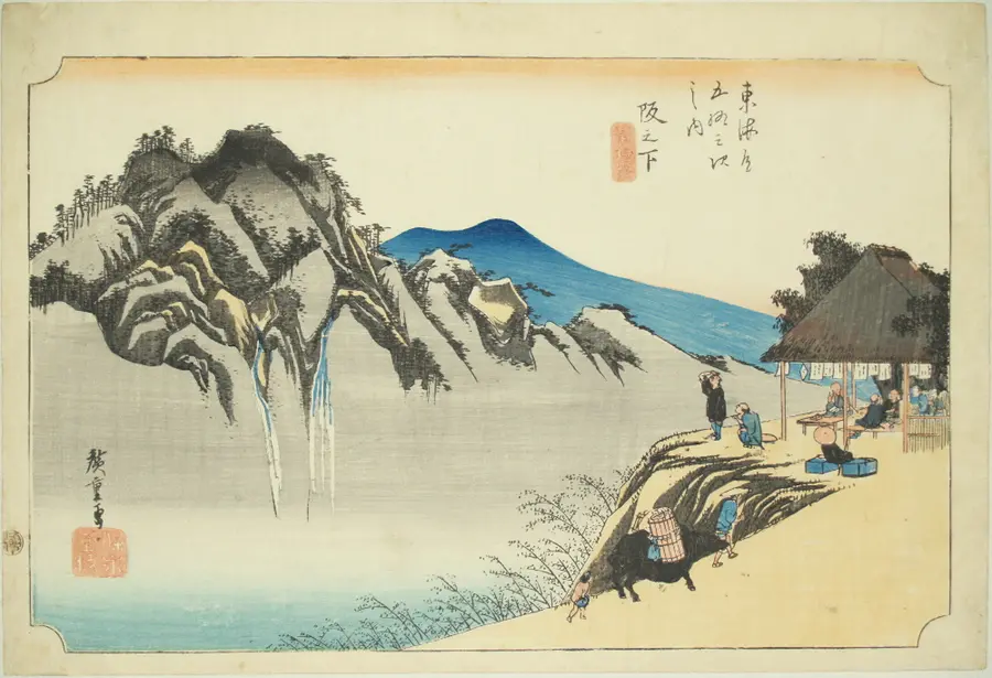 坂下宿は、東海道の難所のひとつである鈴鹿峠を控えていたため、江戸時代後半には本陣3軒、脇本陣1軒、旅籠48軒が軒を連ねる大きな宿場でした。 広重の『筆捨嶺』には、筆捨山や大滝を眺める旅人が描かれています。「筆捨山」は、室町時代の画家である狩野元信が、この山を描こうとしたところ、雲や霧が立ちこめ目まぐるしく山の様子が変化したため絵が描けずに筆を捨ててしまったことからその名が付いたと言われています。