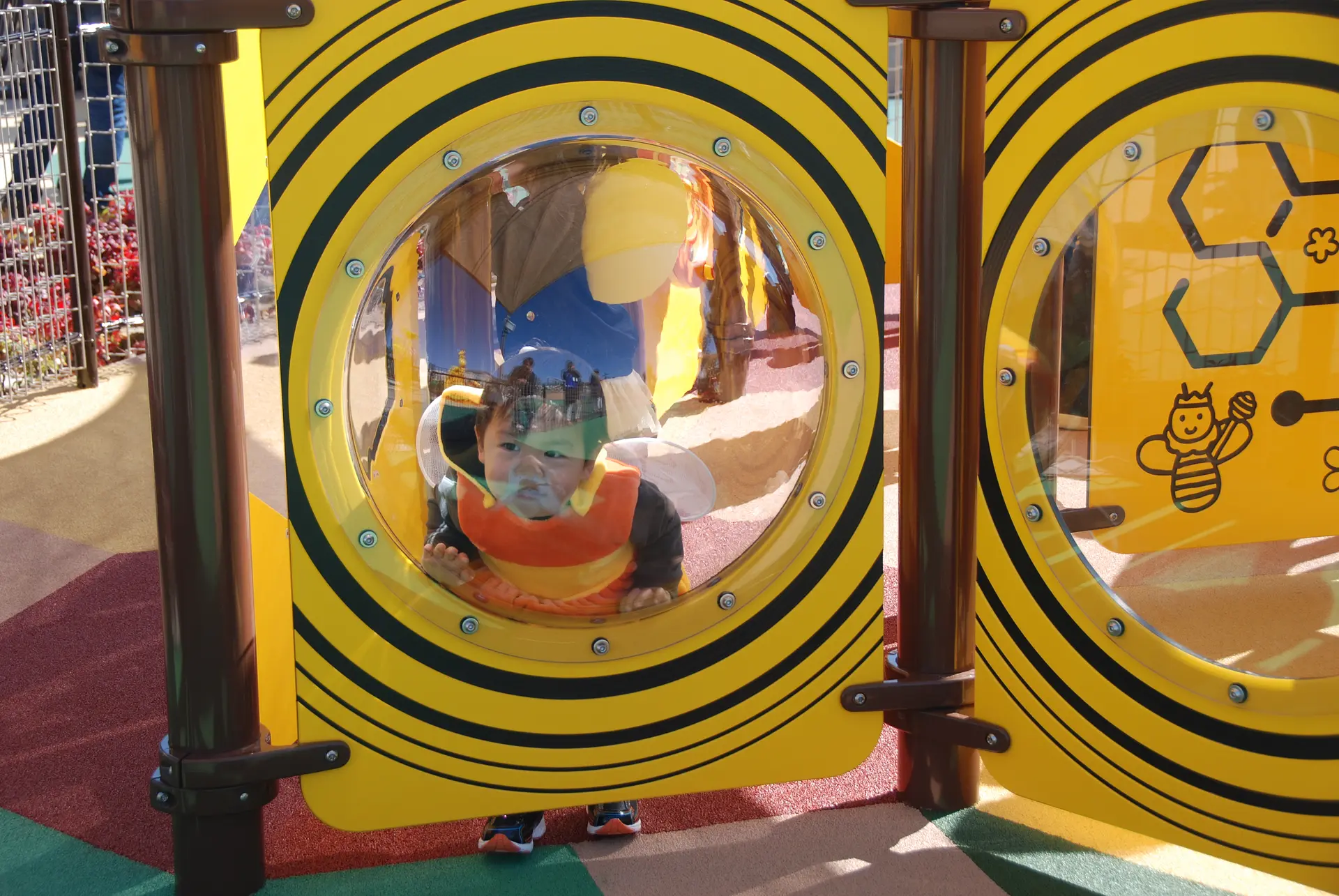 こちらは「ぶんぶんハウス」といって蜂の巣状に区切られた、ぶんぶんばちの家です。部屋の壁には伝え歩きや微細運動ができる仕掛けがあり、探究心や創造力を伸ばすことができるそう。お鼻がつぶれちゃうくらい、お父さんをじっと見ていた子が。とってもほほえましい姿を見ることができました!