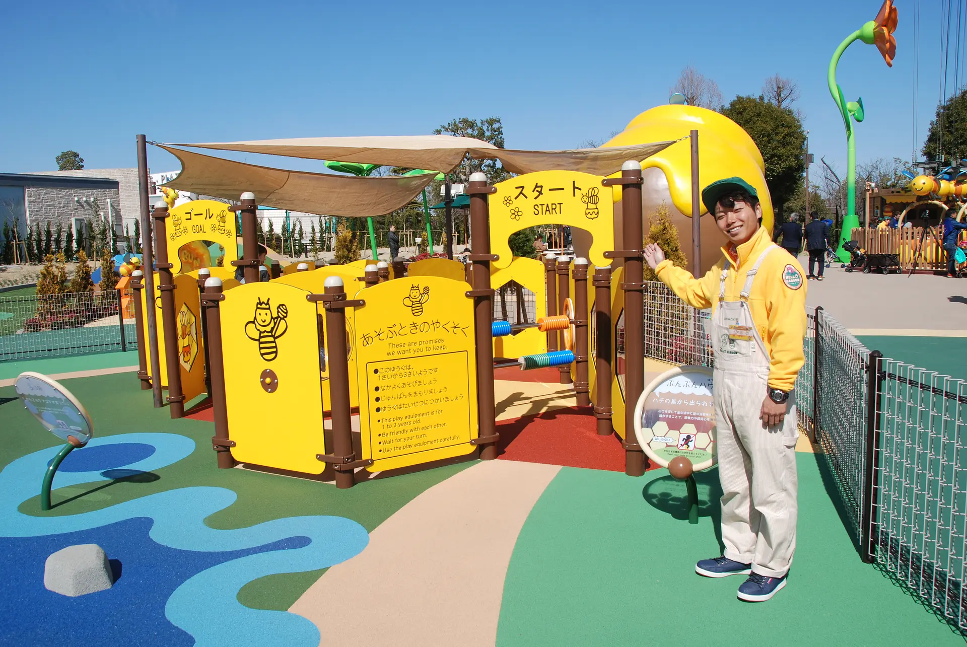 もう一つ新しく登場したのは、プレイフィールド「ぶんぶんばちひろば」。地元三重大学教育学部教員の監修のもと、3歳以下の小さなお子様を対象に成長に合わせた遊びを体験できる広場です。蜂の気持ちになりきり思い切り遊ぶことができますよ。