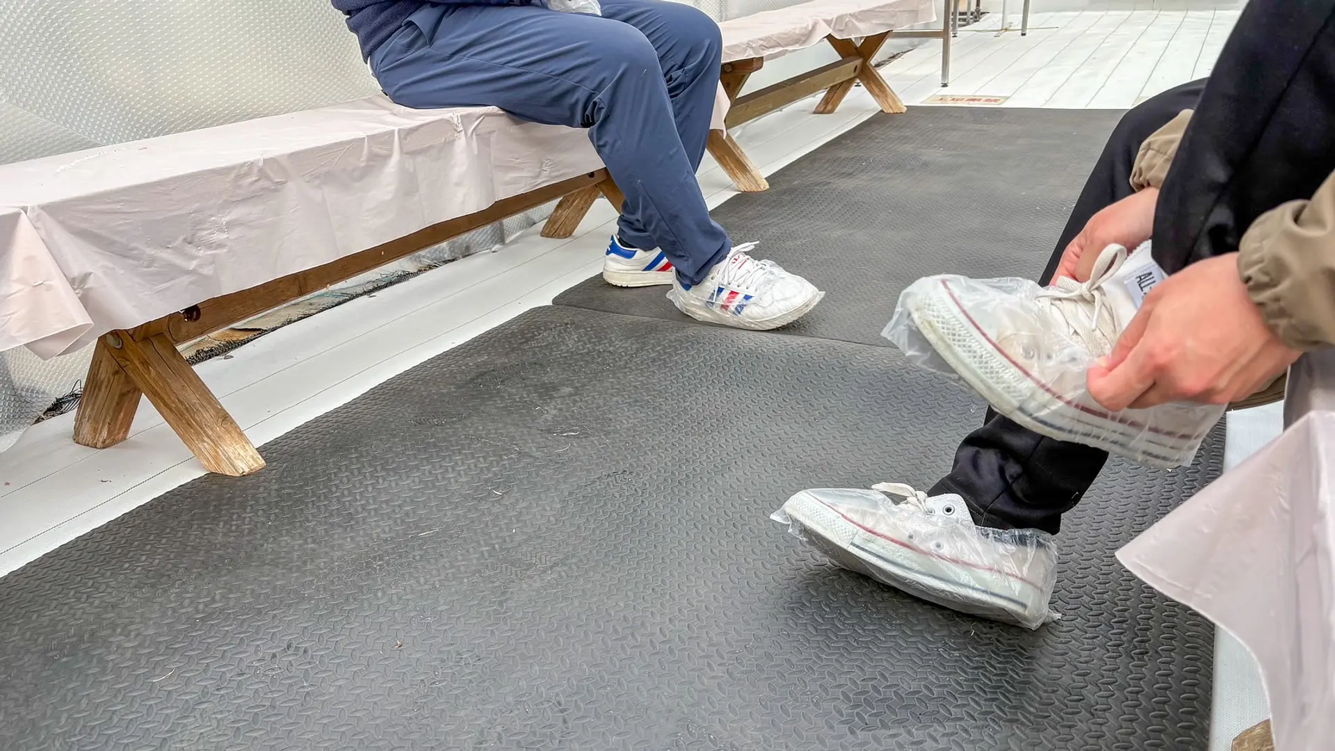 ハウスに到着したら、まずは靴の上にシューズカバーを着用します。土足禁止としているのは、ハウス内への微生物の侵入を極力抑え、いちごを守るためです。これは農薬の使用量を抑えることにも繋がっています。