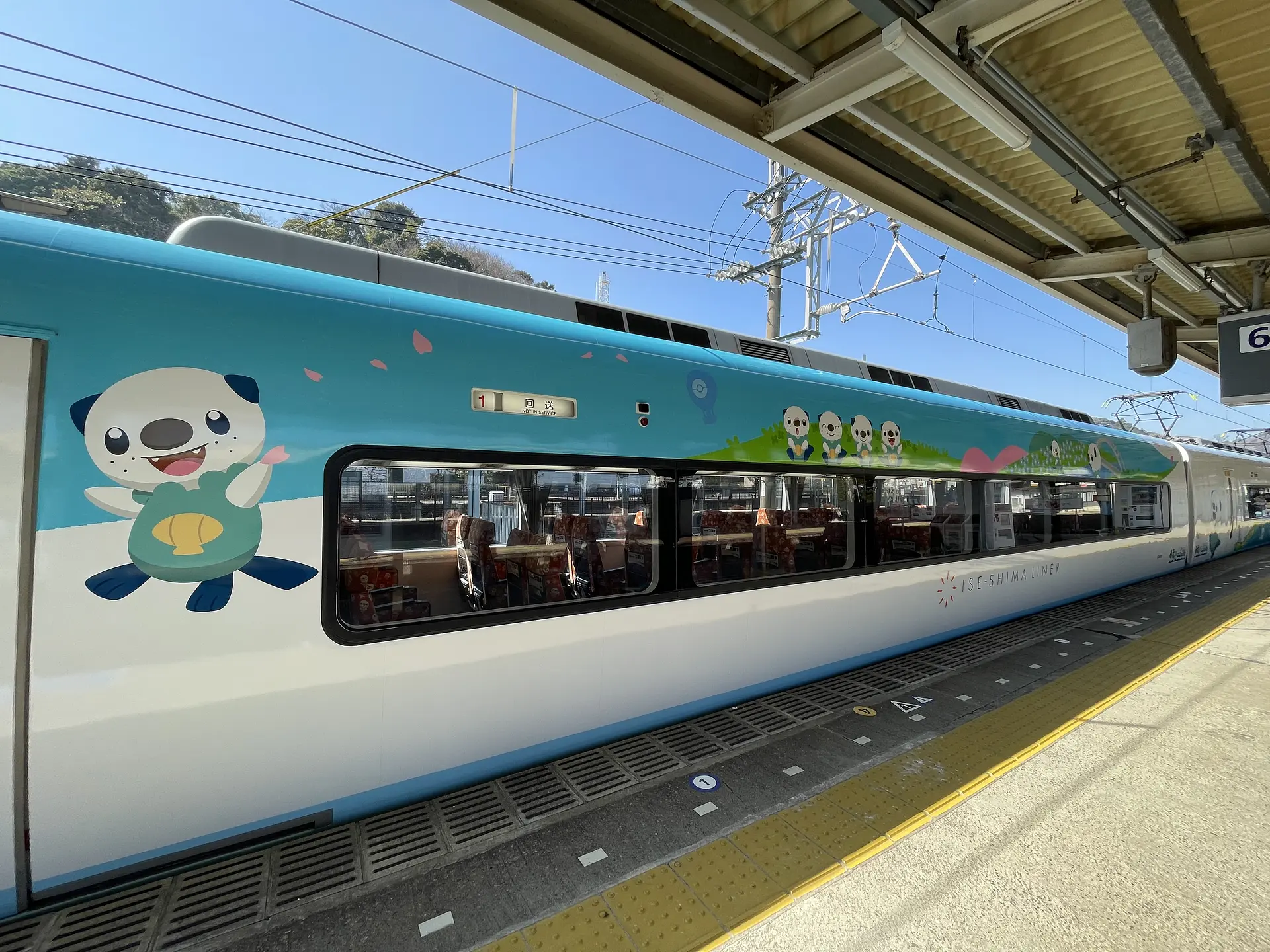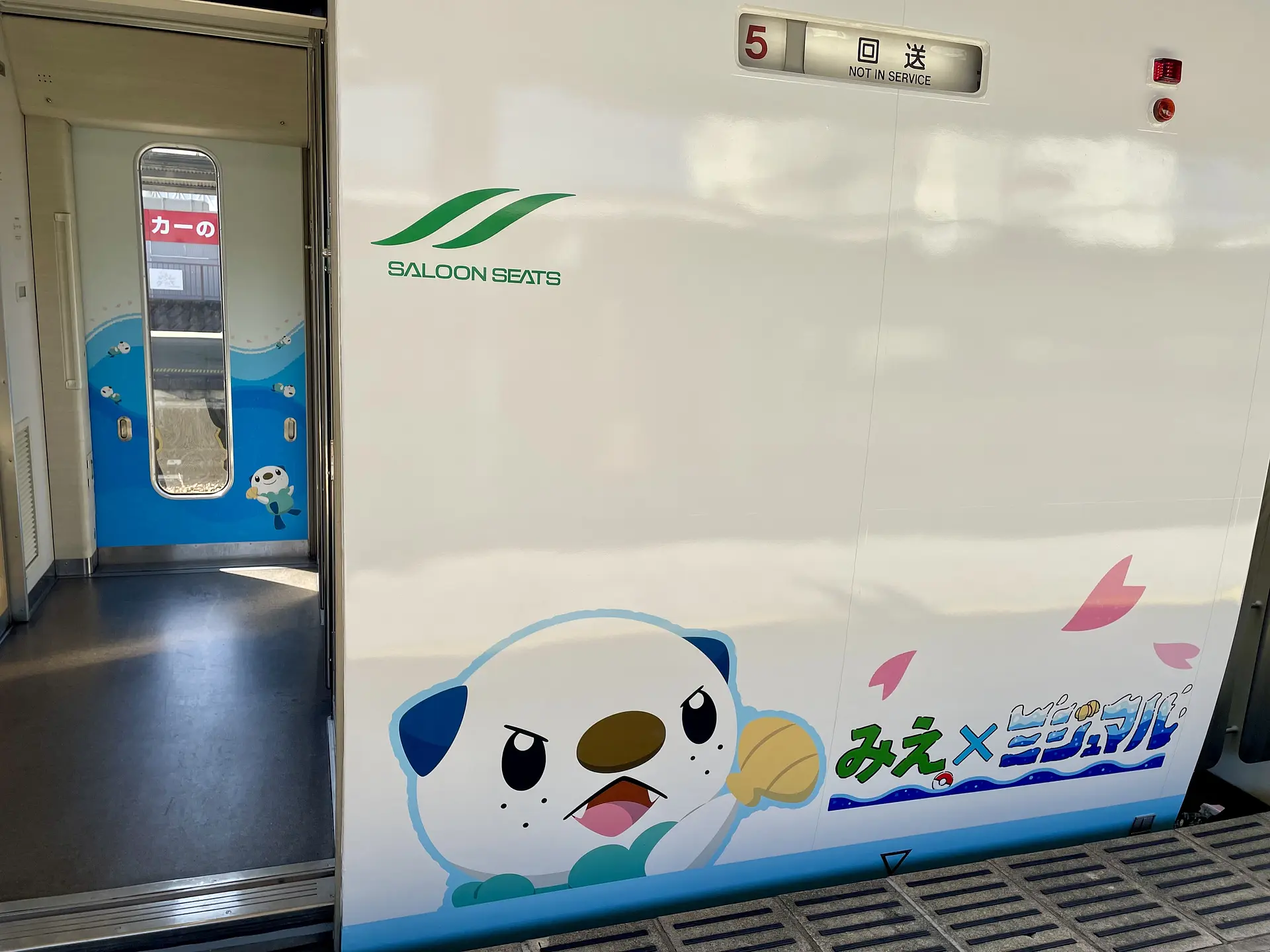 ミジュマルライナーとは、近鉄特急「伊勢志摩ライナー」の外装・内装に、みえ応援ポケモン「ミジュマル」と、伊勢志摩をはじめとする三重の自然あふれる景観や特徴のイメージがデザインされたラッピング列車の愛称です。