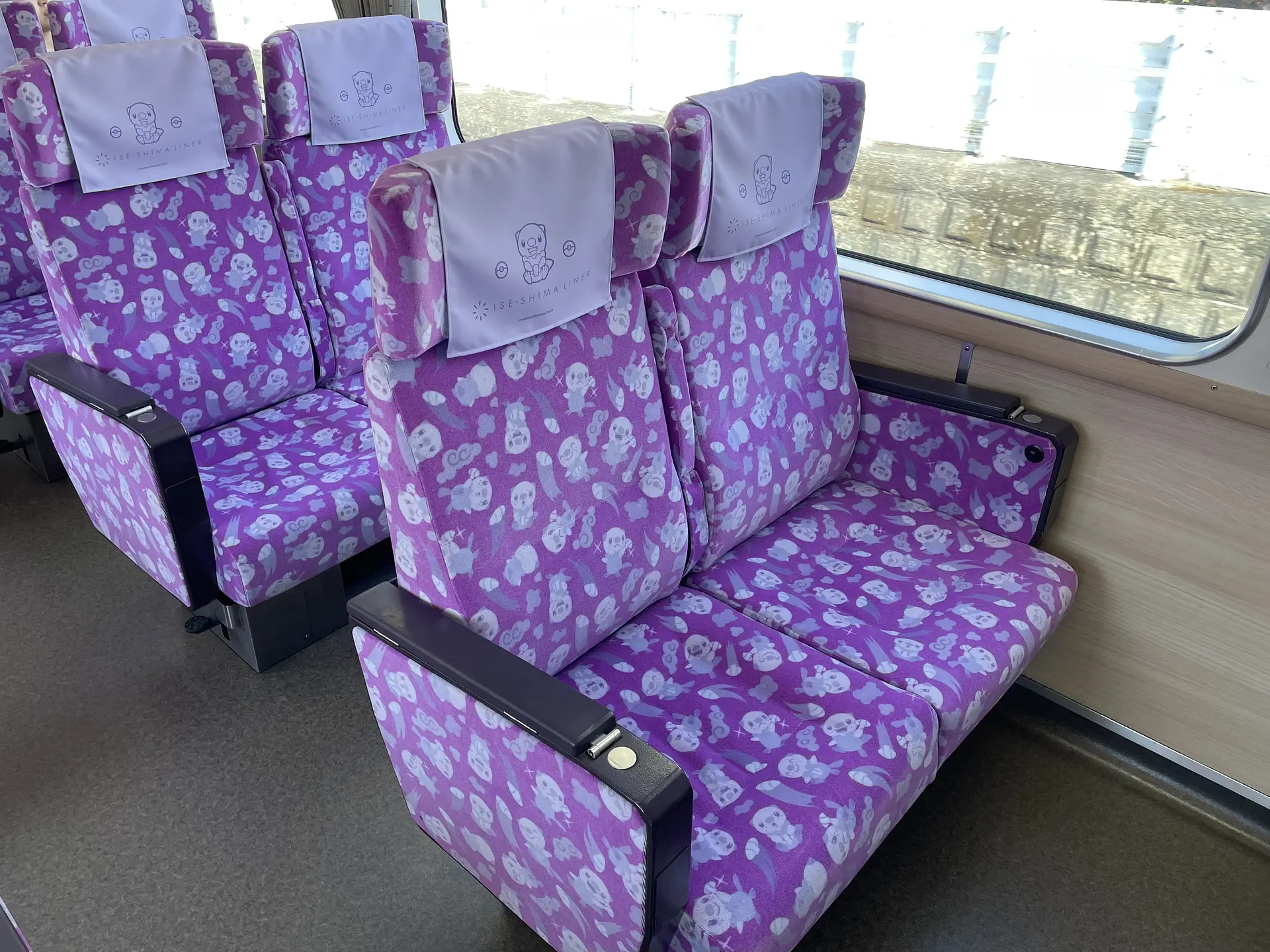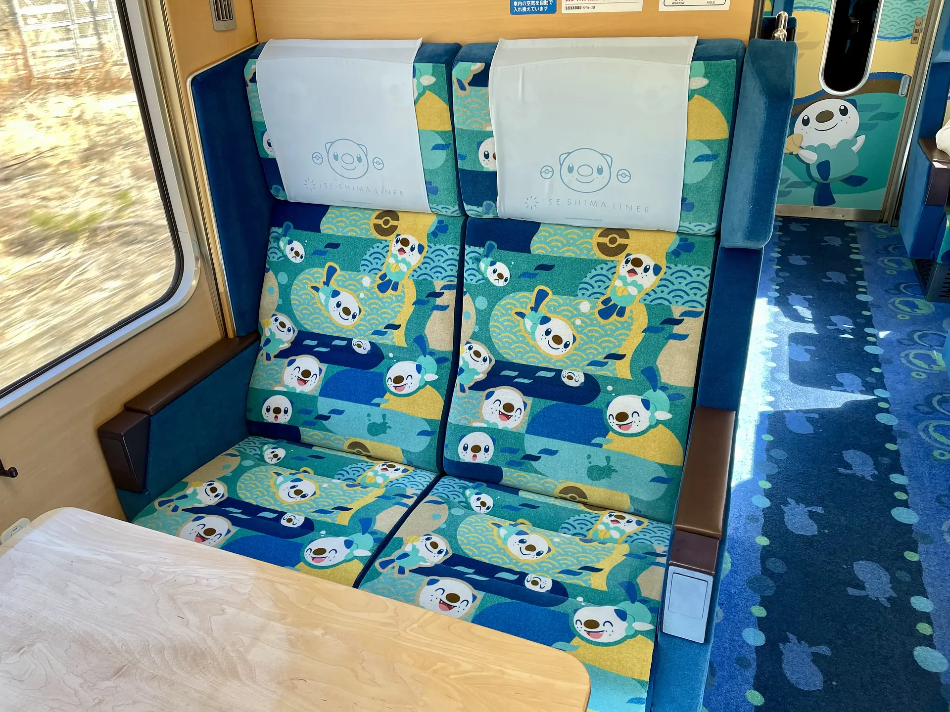 特に注目の座席がサロン席・ツイン席です!3〜4人用のサロン席と2人用のツイン席で構成されており、座席シートにはたくさんのミジュマルがデザインされているんです!床の絨毯にもミジュマルのシルエットがデザインされた特別仕様で、他の車両よりもミジュマルに囲まれた、ミジュマルライナーらしいスペシャルな空間で過ごすことができますよ!