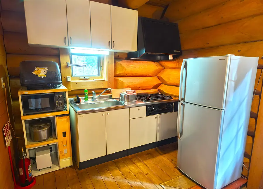 コテージのサイズはそれぞれ違いますが、全ての棟にキッチン、リビングスペース、トイレ、お風呂、BBQスペースが付いています。エアコンはもちろん、冬にはこたつなどの暖房器具、テレビなどの家電も一通りそろっていますよ!