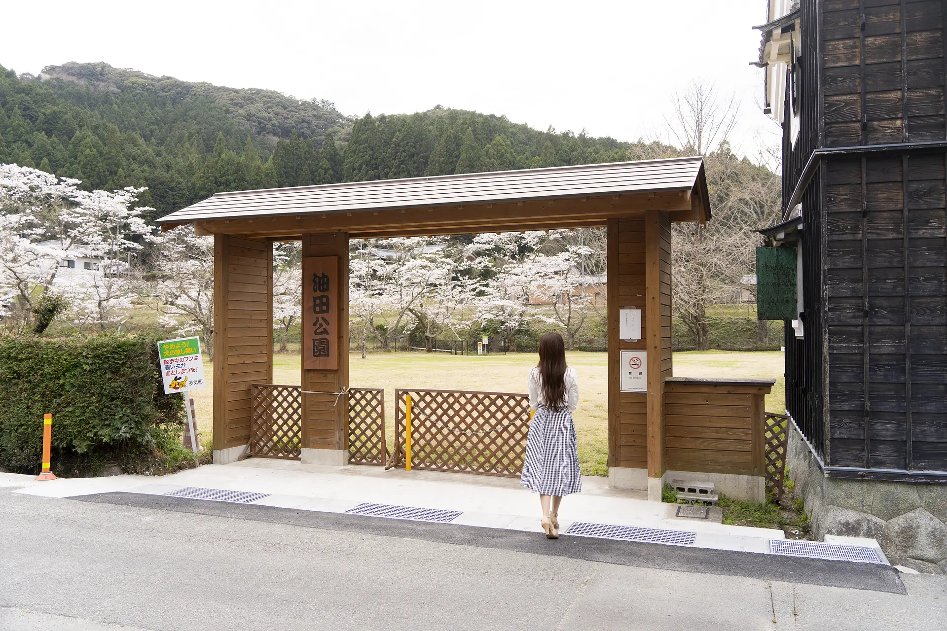 タイムスリップしたかのような明治時代の風情ある建物が今も残る「油田(ゆだ)公園」。周辺の里山の景色と桜、歴史的な建物の共演が見どころです。