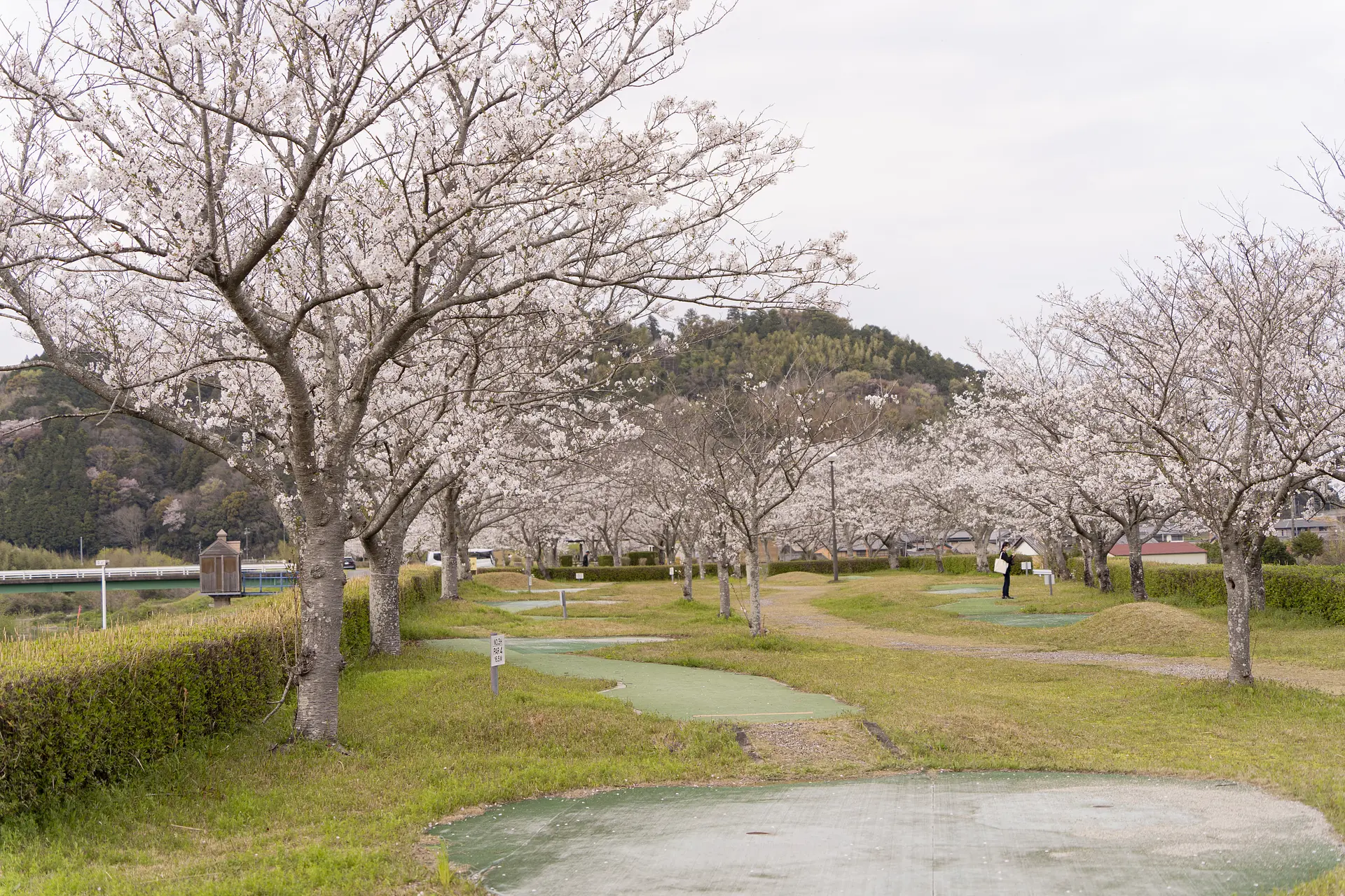 JR多気駅近くの桜の名所。佐奈川に沿って、約100mの桜並木が広がります。ゲートボールやパターゴルフを自由に楽しめるコースもありますよ。