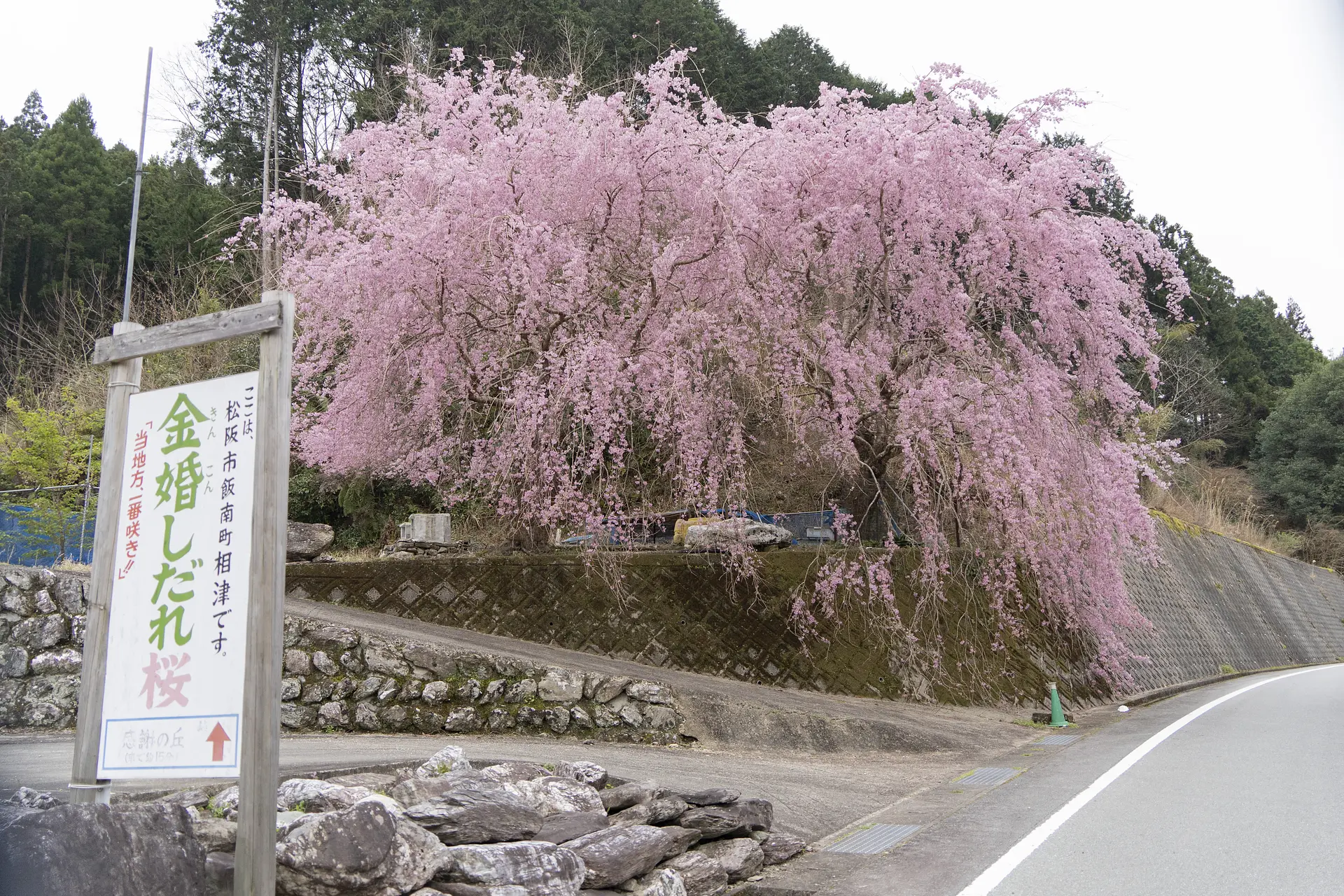 「当地方、一番咲き!」というレトロな看板が目印の「金婚しだれ桜」は、松阪市飯南町相津に突如現れる立派な枝垂れ桜です。ソメイヨシノより1週間ほど早く見頃を迎えます。