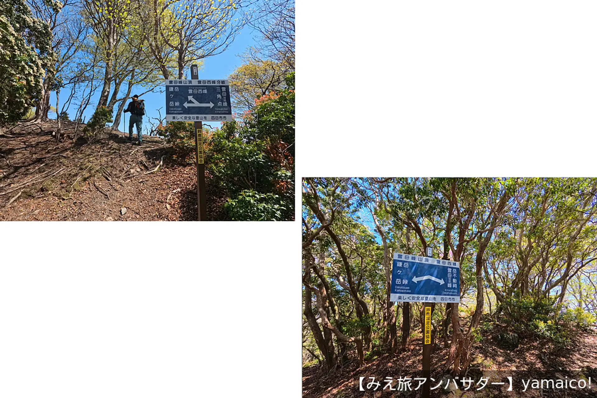 雲母峰からさらに歩くこと約5分、雲母峰西峰に到着します。分岐看板があり、看板から矢印方向へ進むと鎌ヶ岳方面へ縦走ができます。今回は、雲母峰独票(P791)にも向うため、鎌ヶ岳方面方向へ進みます。