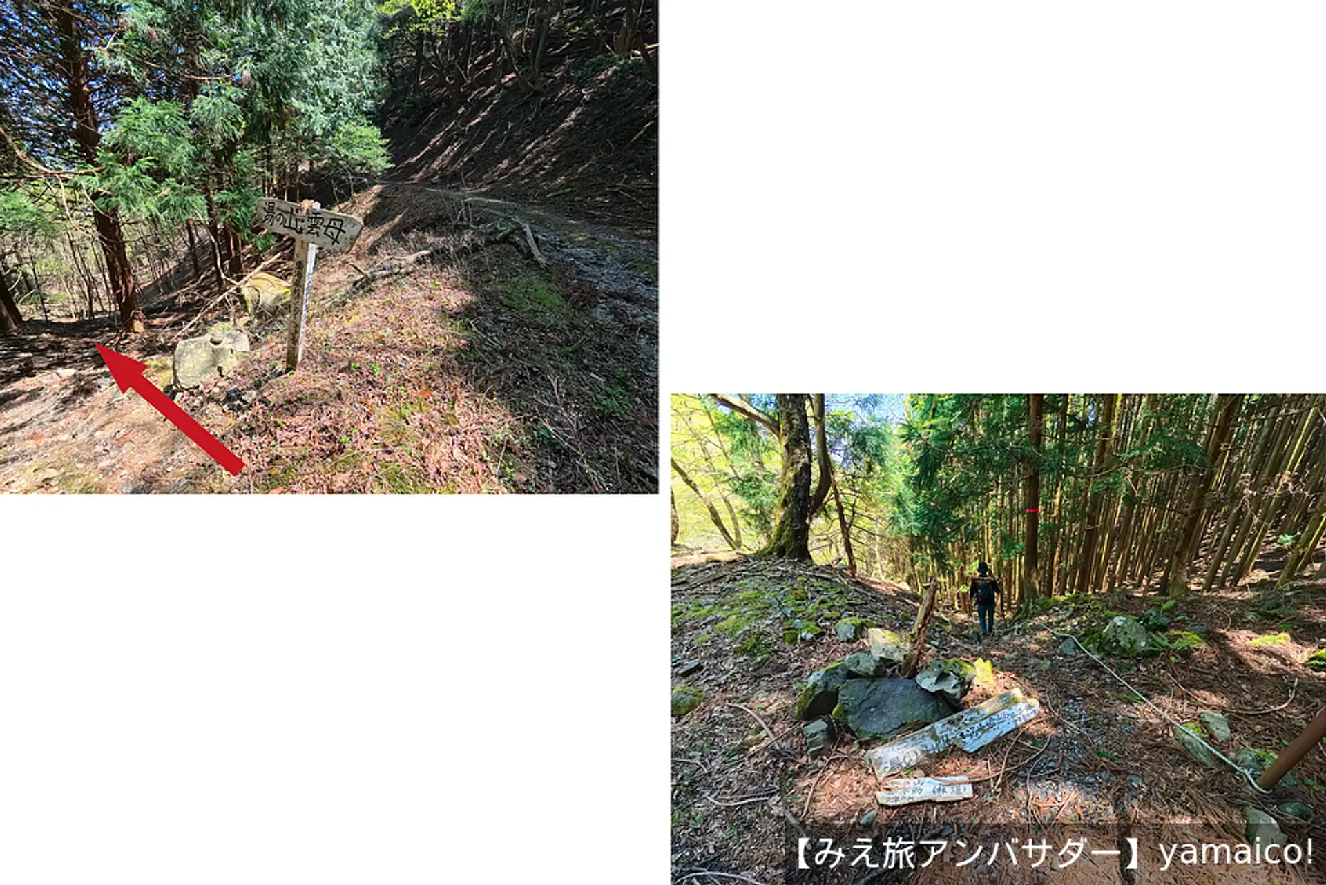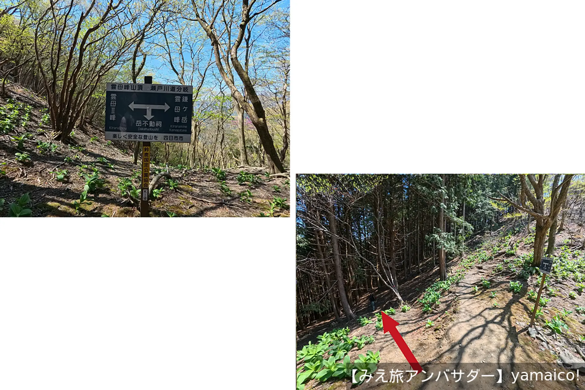 先ほどの分岐より10分ほど歩くとP791東巻き道分岐地点に到着します。東巻き道は、崩落の危険性があるため、「P791経由」と書かれた看板の方向(上の看板)の指示に従って進みましょう。