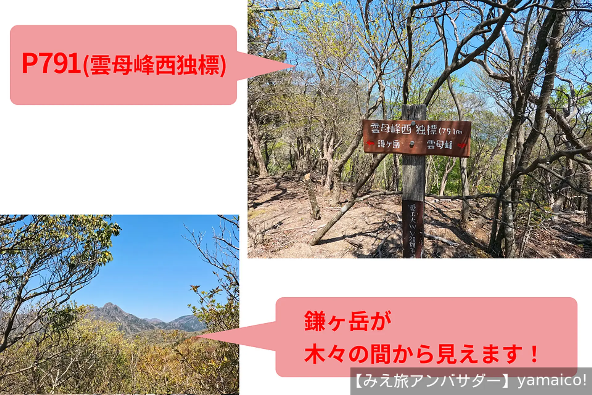 P791東巻き道分岐地点からさらに10分歩くと雲母峰独票(P791)に到着します。木々の間から鎌ヶ岳を見ることができます。