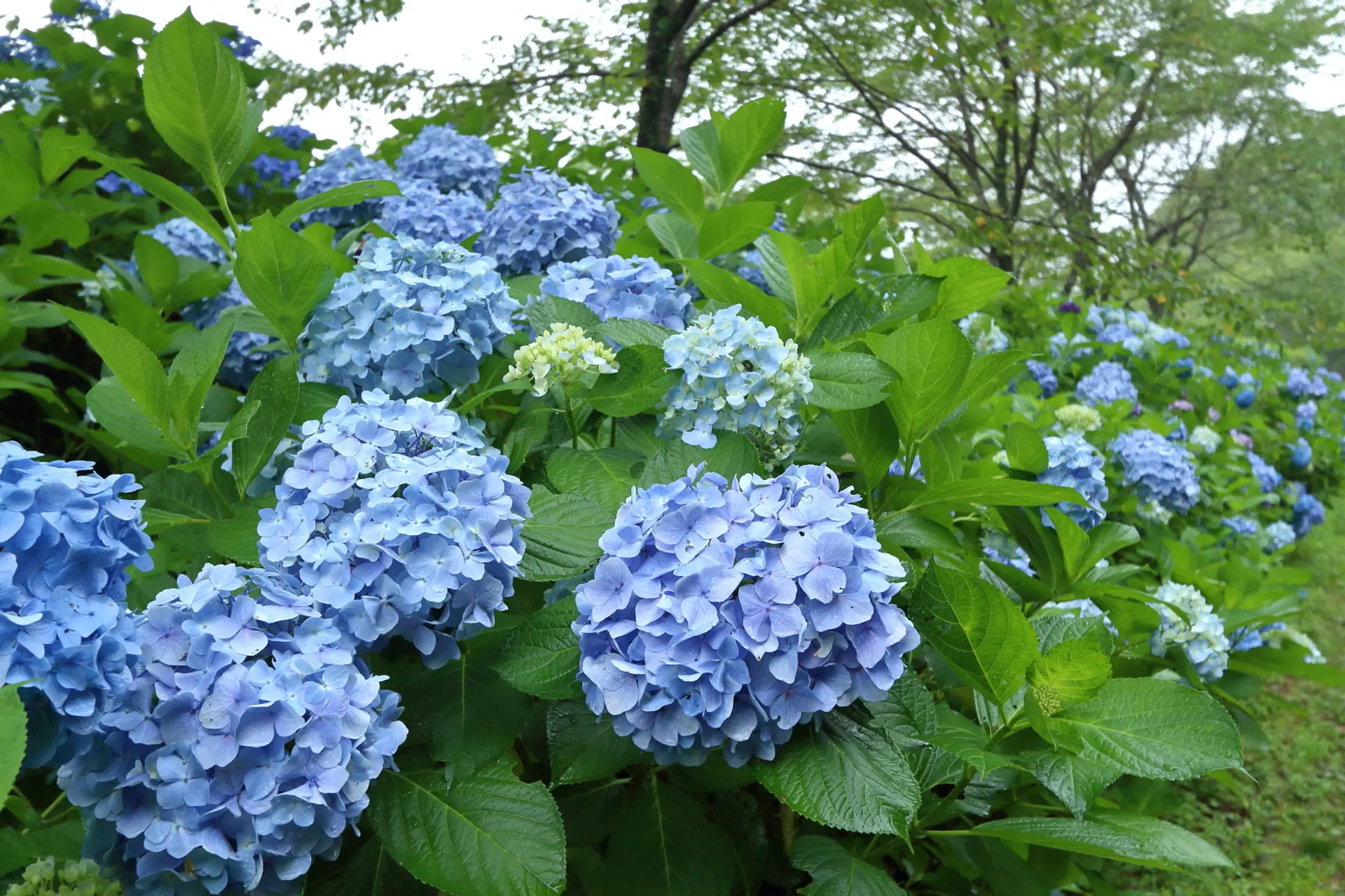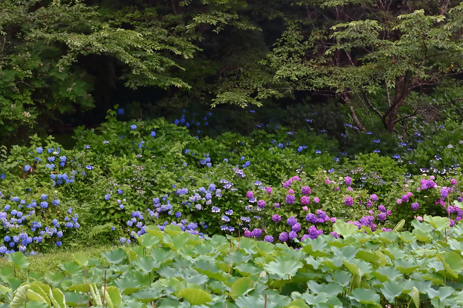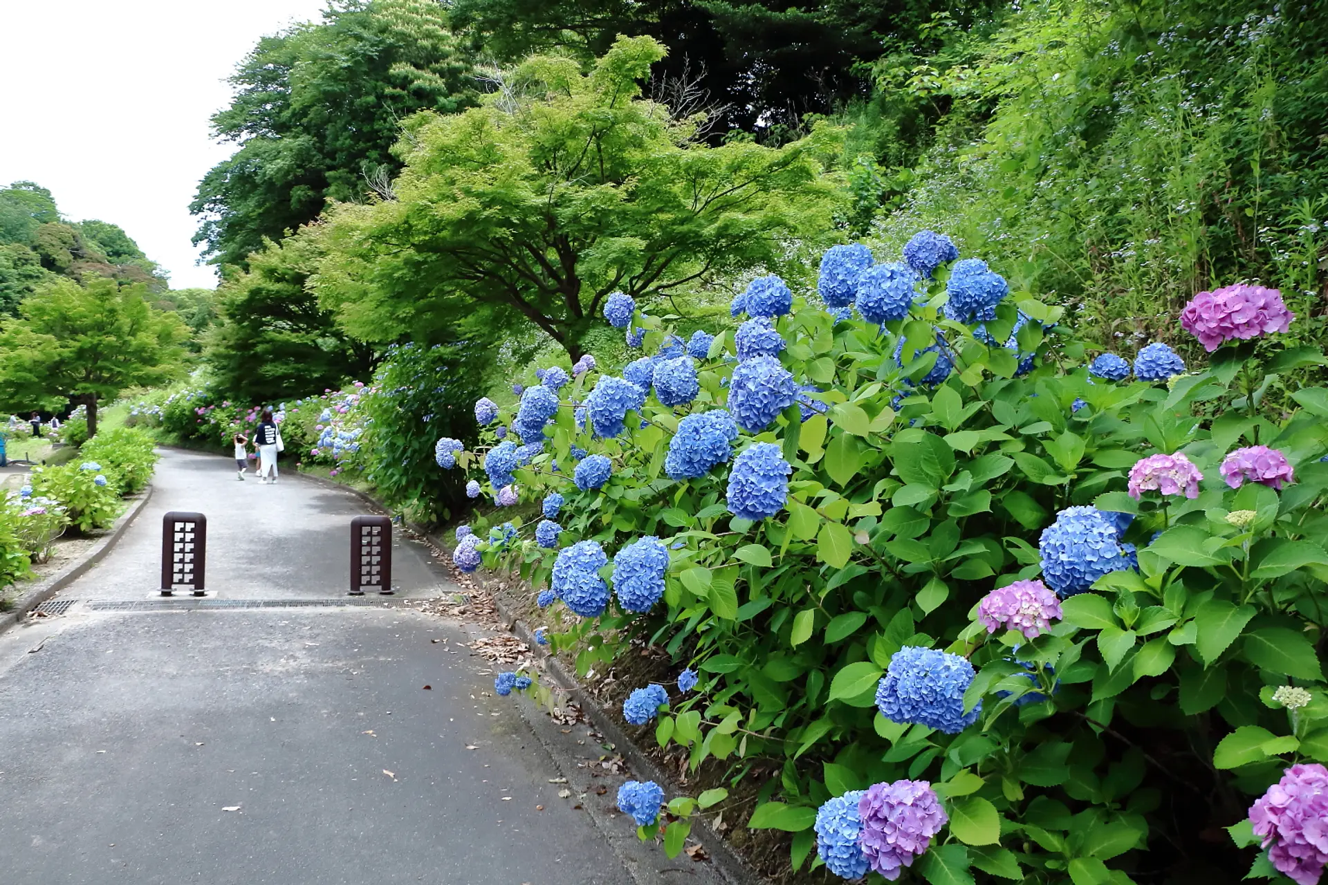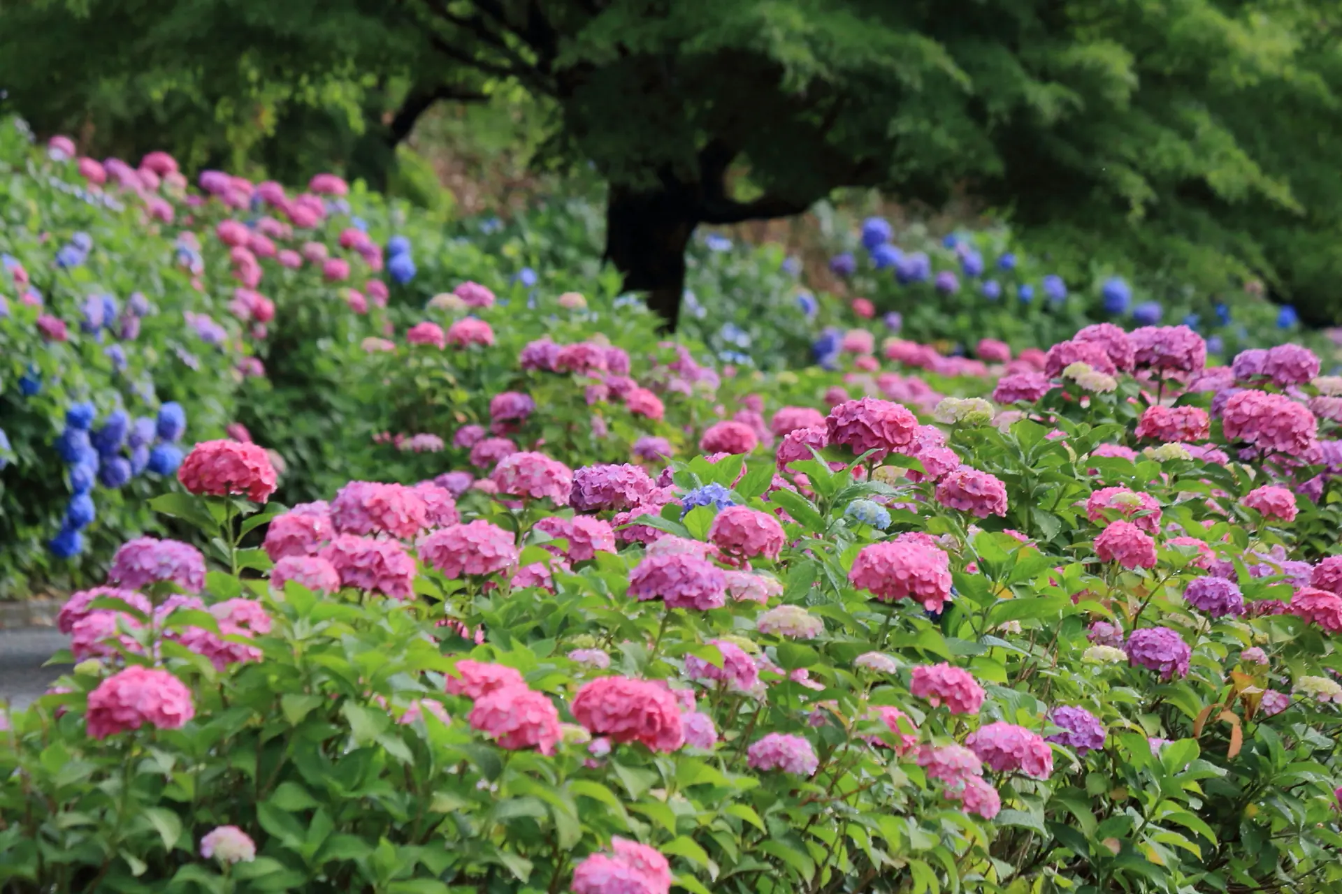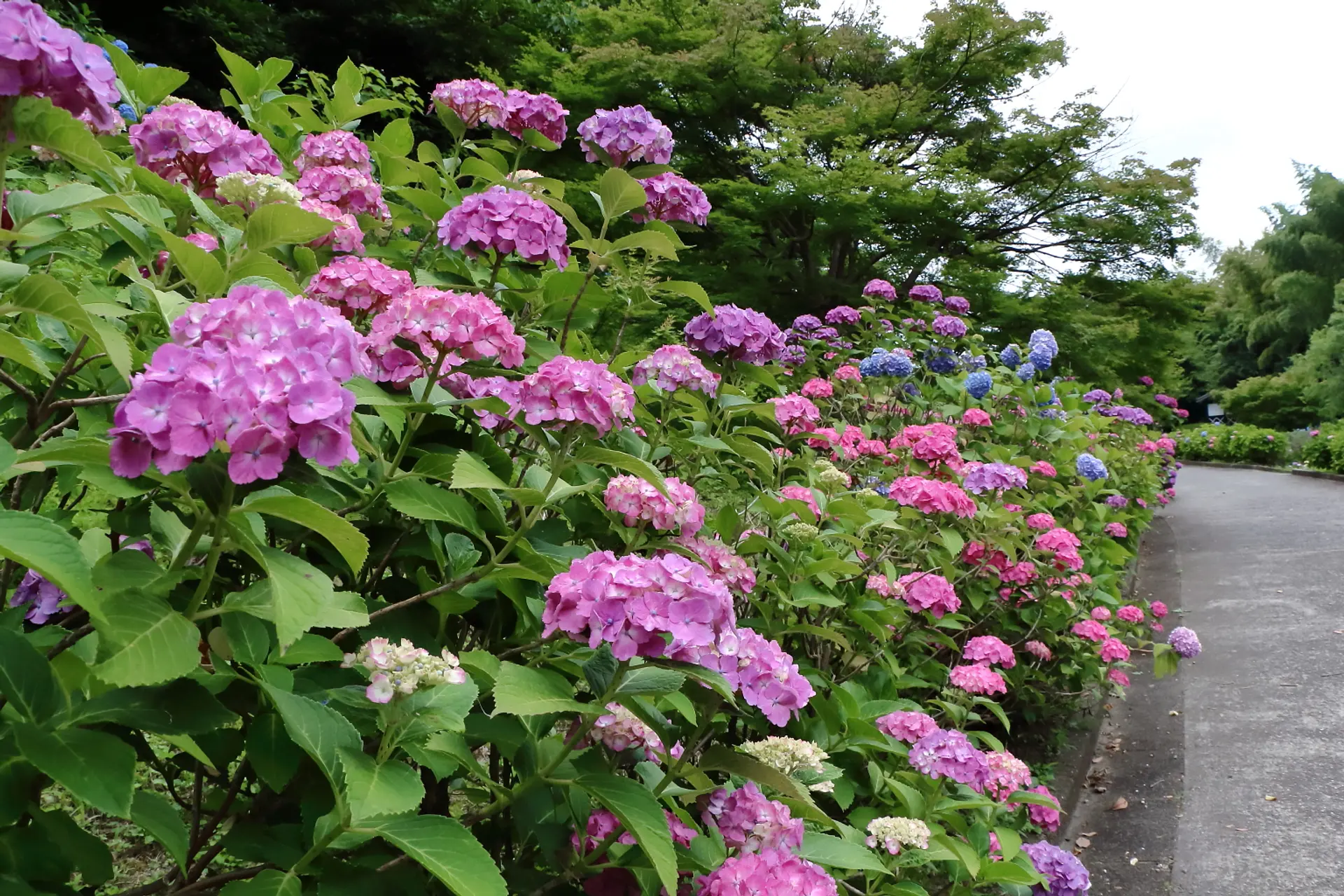 園路の両側の紫陽花を重なるように眺めると、こんなに密度の濃い紫陽花が楽しめます。