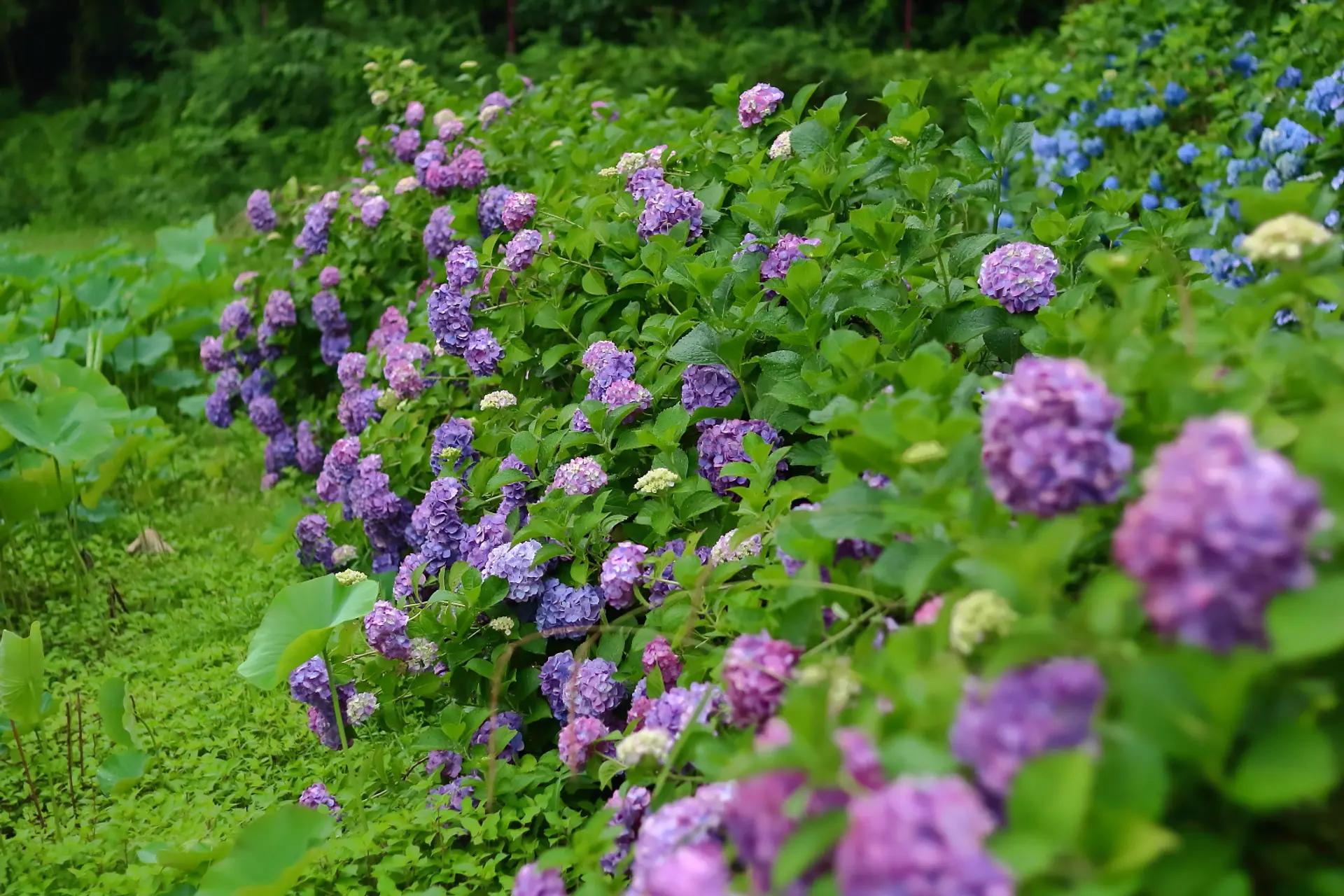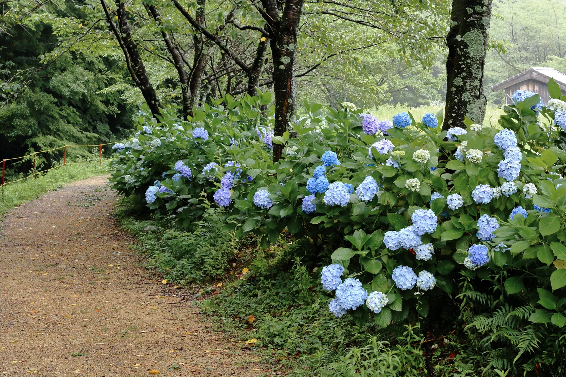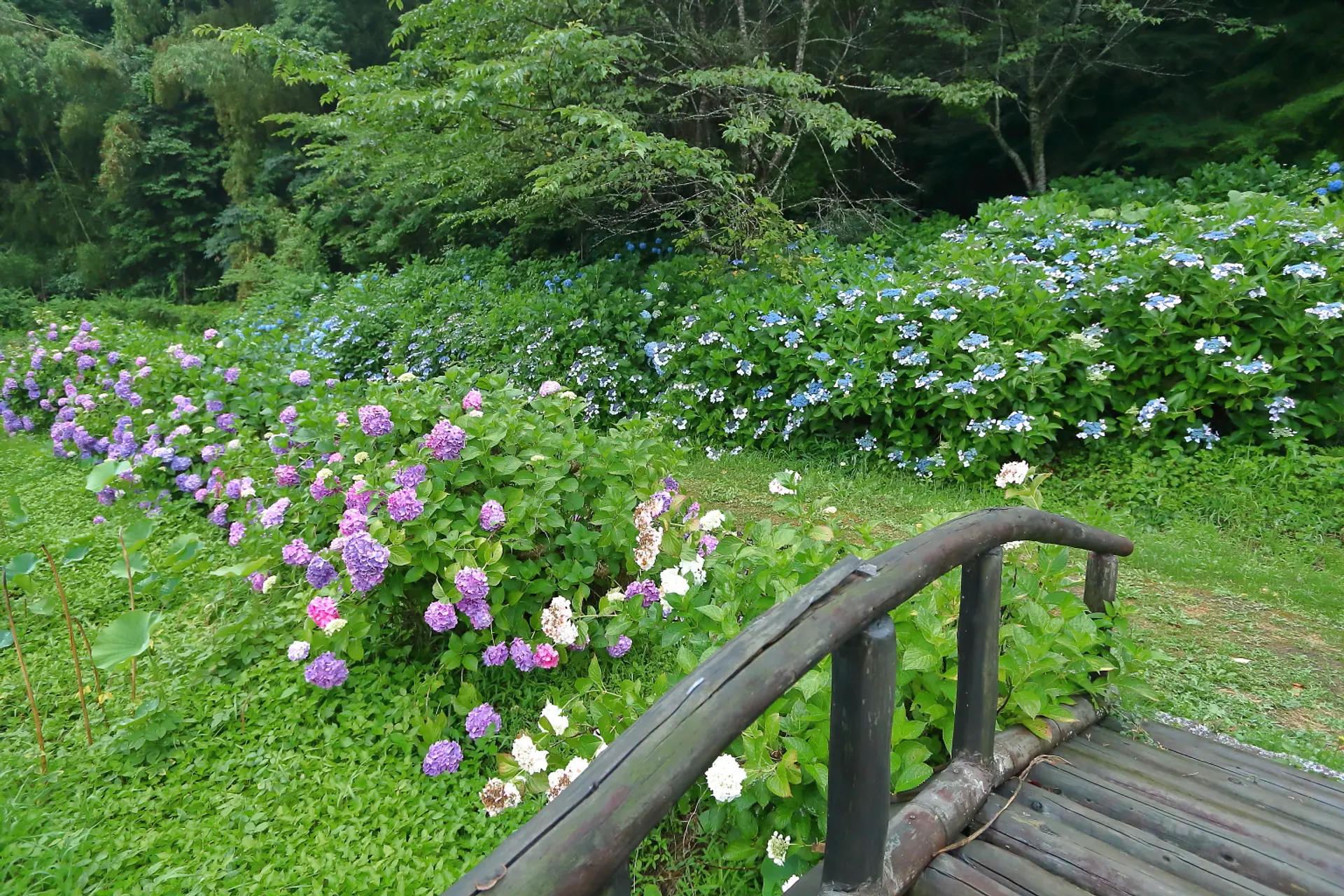歩道や木道に沿って歩くと、山際に近いところに紫陽花が広がっています。