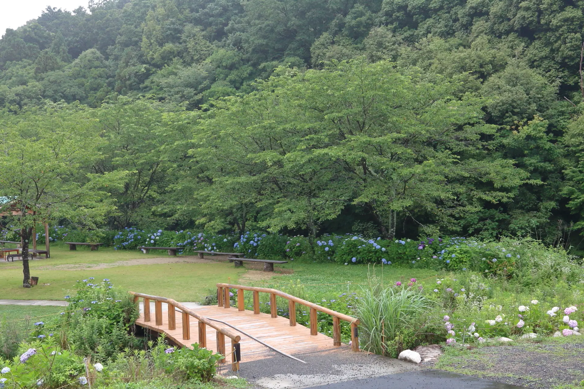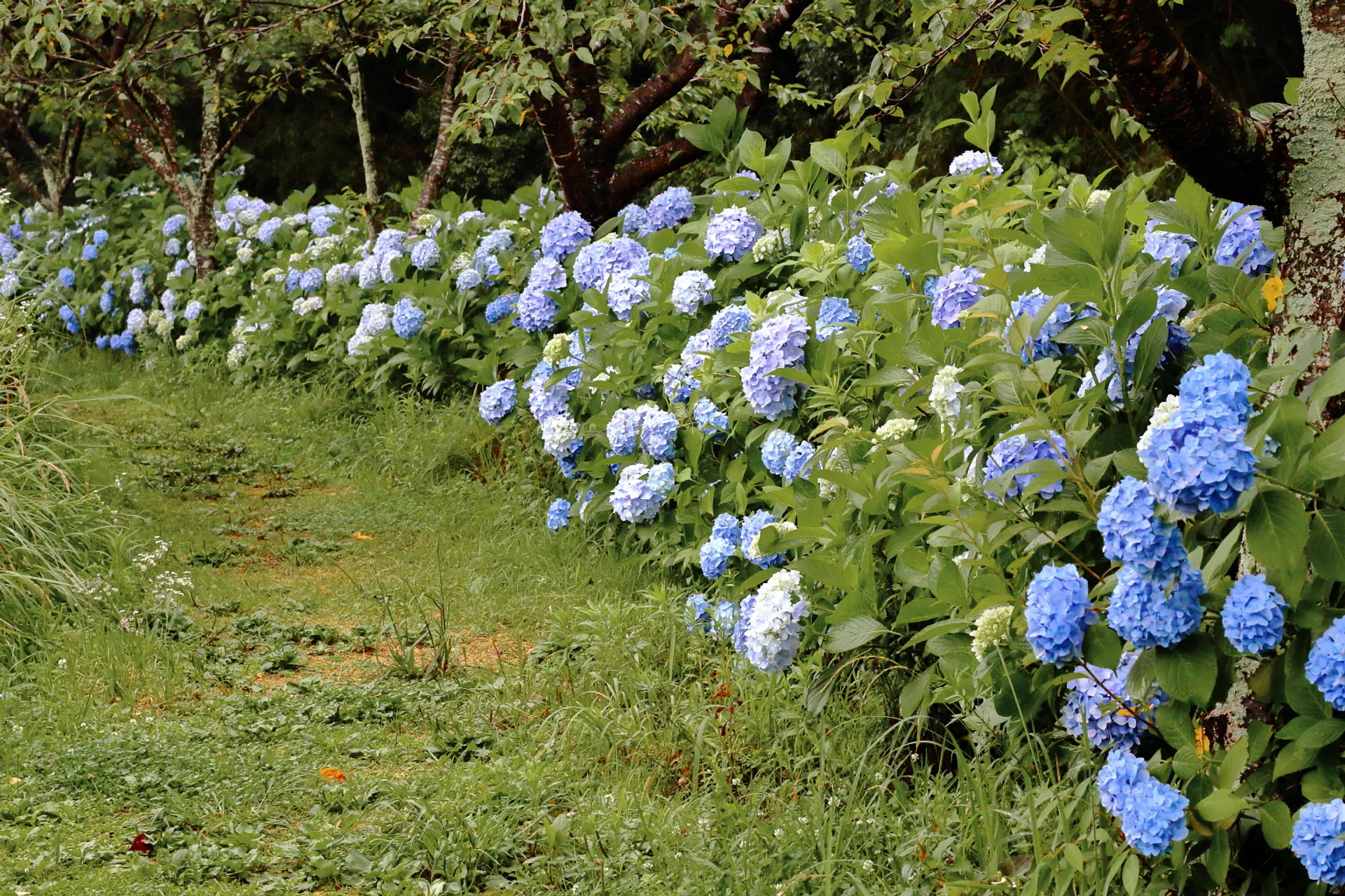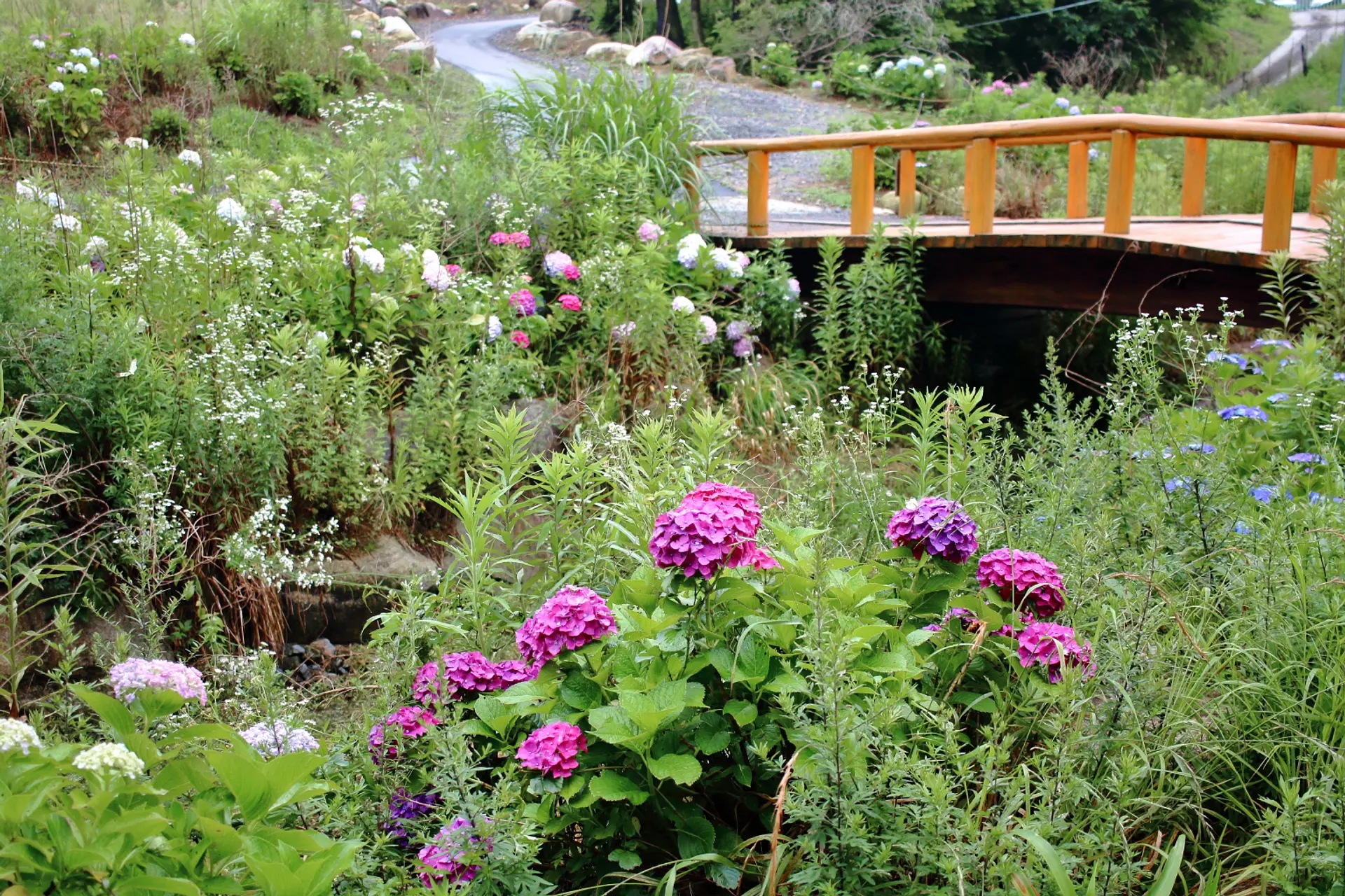 歩道や木道に沿って歩くと、山際に近いところに紫陽花が広がっています。