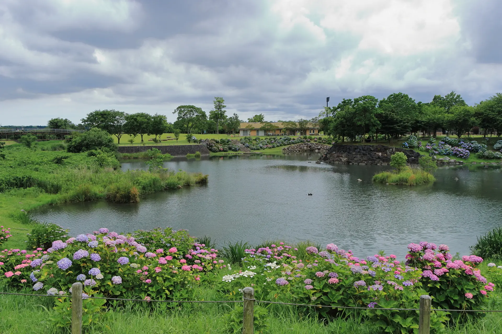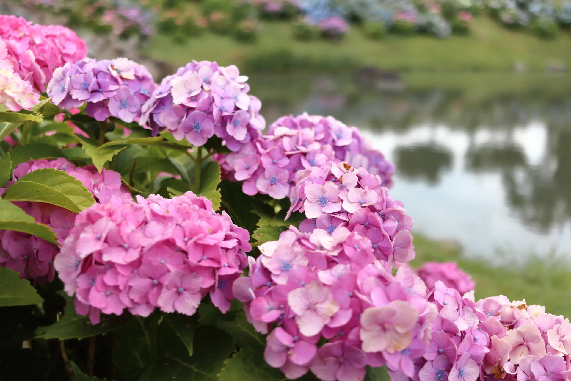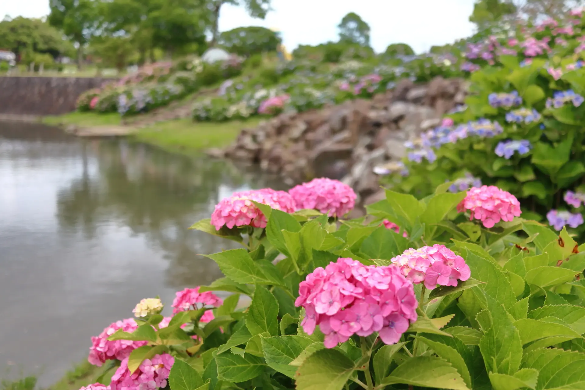 池の周りをぐるりと囲むように、数多くの紫陽花が植えられていて、